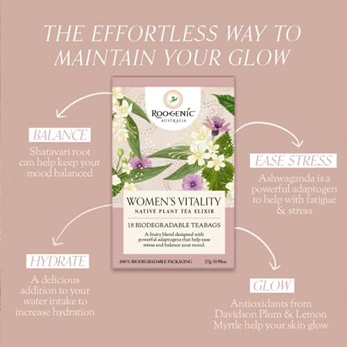 Delicious hot, or as an iced tea, Roogenic Women’s Vitality is the perfect addition to your water intake to help with hydration. It is also 100% caffeine-free.Lemon Myrtle, Aniseed Myrtle, Davidson Plum, Red Clover Flower, Shatavari Root, Nettle Leaf, Blue Cornflower, Ashwagandha Root, Mint