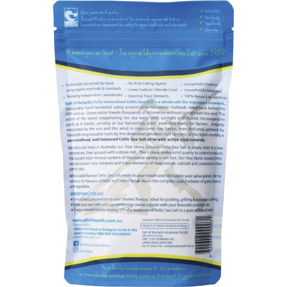 This fine ground variety is convenient and easy to use for the table or cooking. The original Salt of the Earth’s fine grind maintains the natural sparkle of all the essential minerals and trace elements found in 100% fully mineralised sea salt. Dissolves easily.