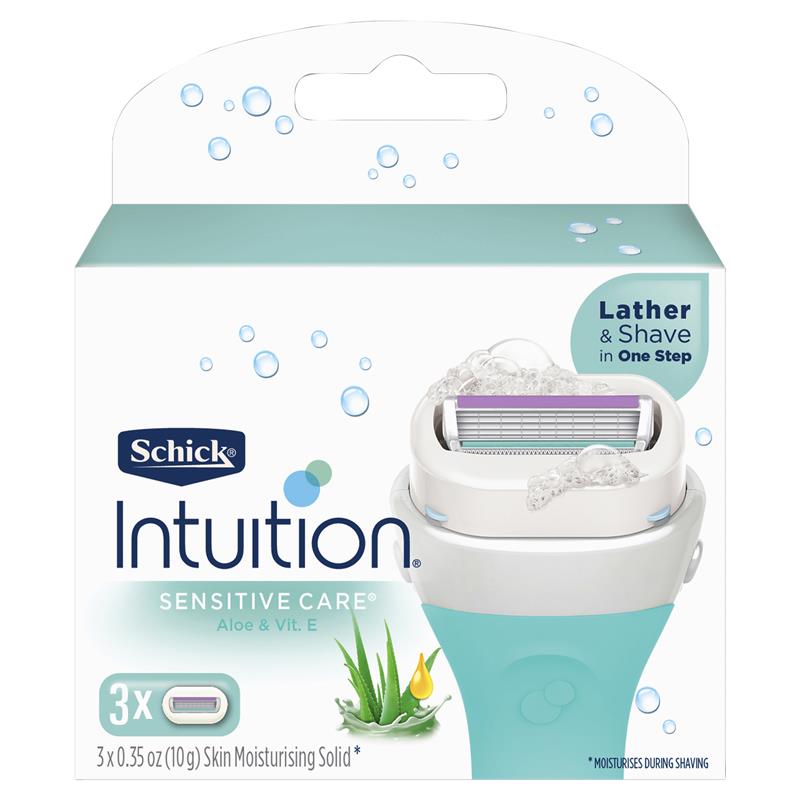 Schick Intuition Sensitive refills have our unique Skin Conditioning Solid formulated with Vitamin E and 100% natural Aloe to help moisturise sensitive skin during shaving. Our hypoallergenic formula is gentle on your skin.CPP