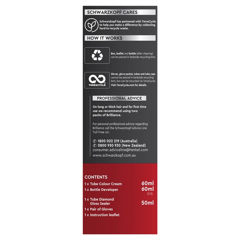 Boxed Contents: 1 Tube Brilliance Colour Creme 60mL, 1 Capsule Diamond Gloss Serum 1mL, 1 Developer Bottle 60mL, 1 Tube Brilliance Colour-Shine Conditioner 22.5mL, 1 Pair of Gloves, 1 Instruction leaflet