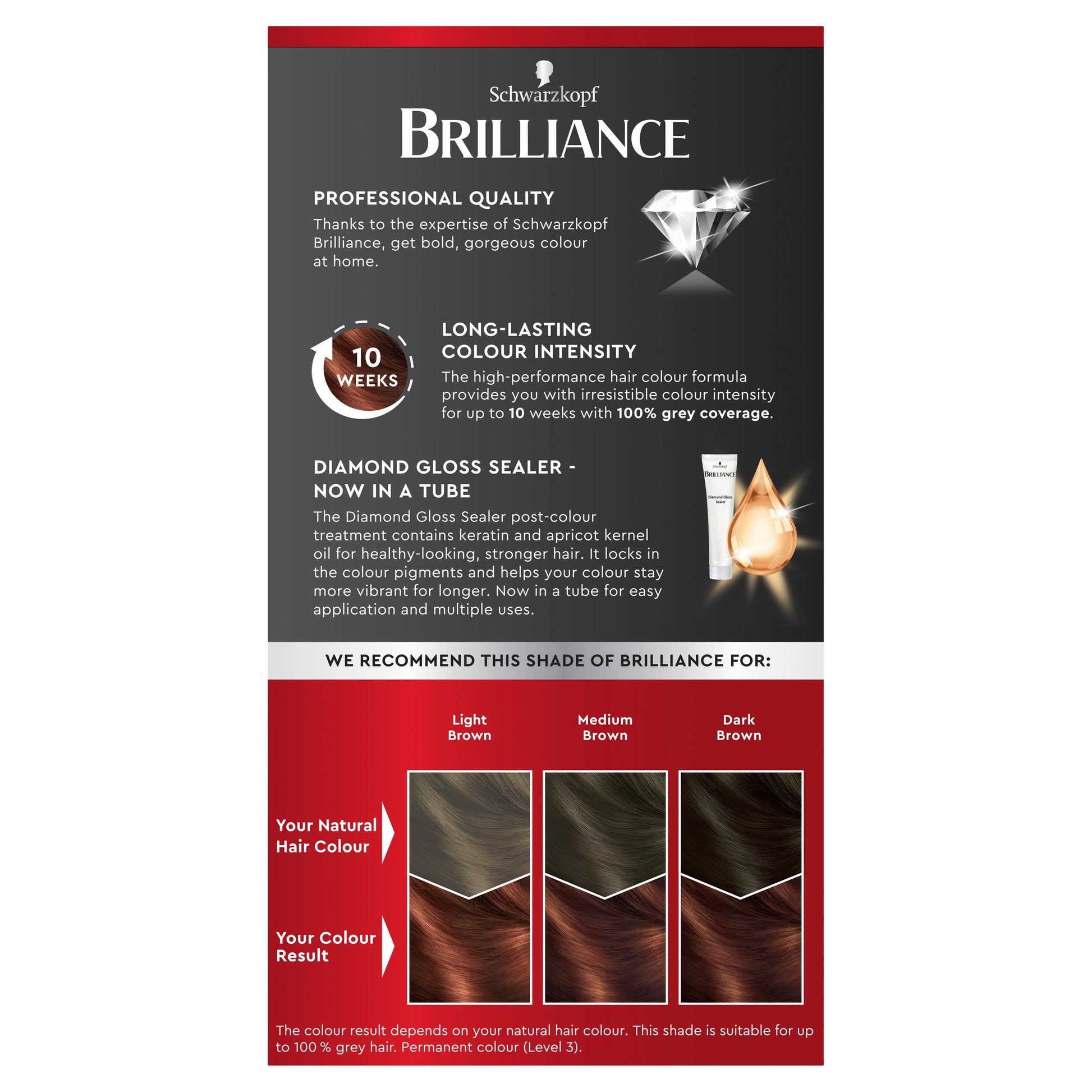 Boxed Contents: 1 Tube Brilliance Colour Creme 60mL, 1 Capsule Diamond Gloss Serum 1mL, 1 Developer Bottle 60mL, 1 Tube Brilliance Colour-Shine Conditioner 22.5mL, 1 Pair of Gloves, 1 Instruction leaflet