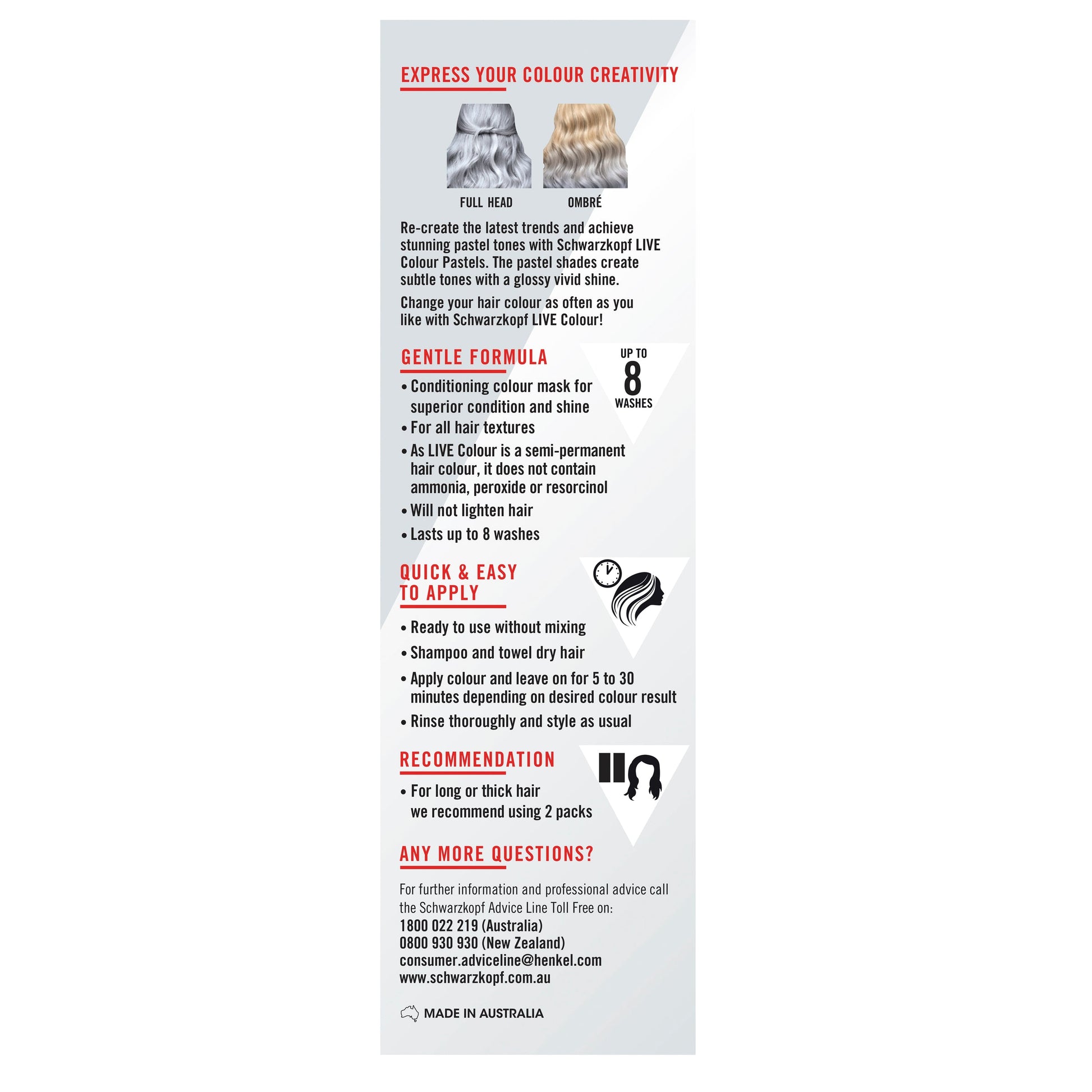 Schwarzkopf Live Colour Pastels by Ultra Brights Cool Grey creates stunning pastel colours with a glossy, vivid shine, is semi-permanent, good for 8 washes, and contains no ammonia.