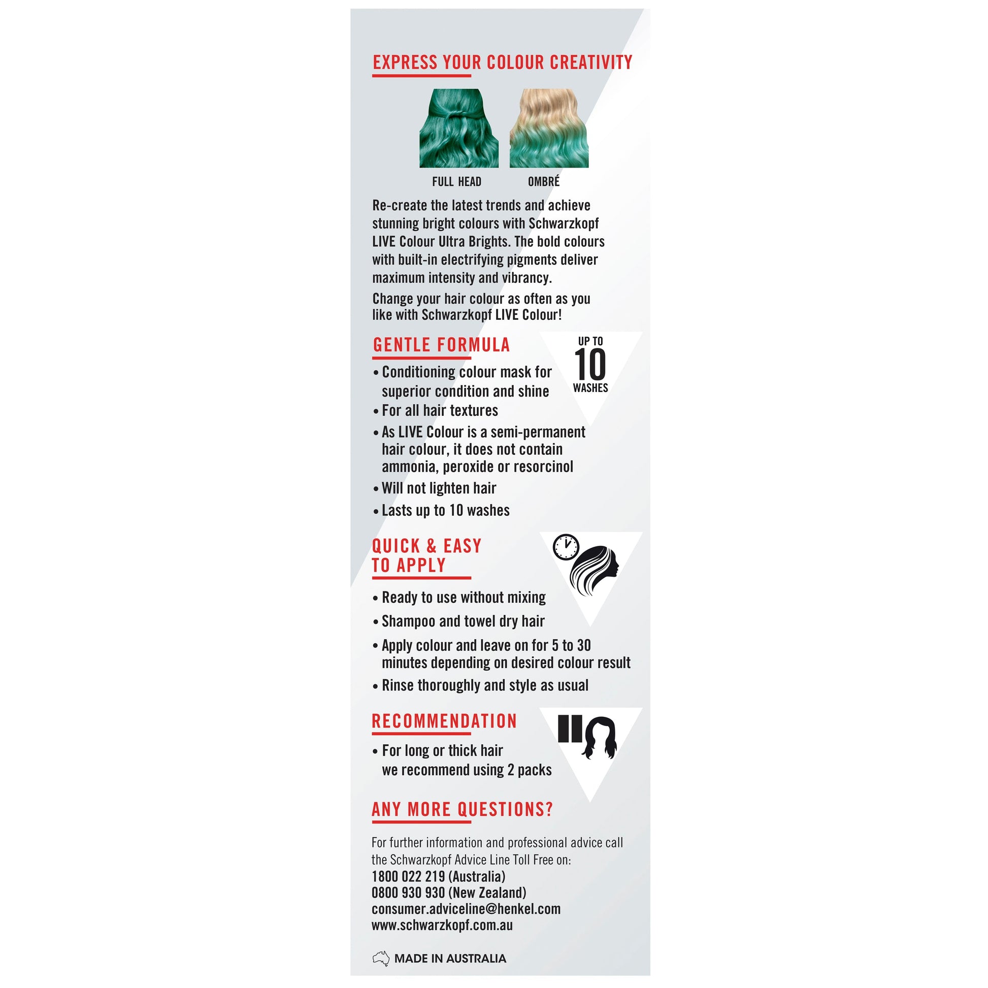 LIVE Colour Ultra Brights can be used on the full head or to achieve a dip dye look. LIVE Colour is an enriching colour mask that adds condition and vivid shine to your hair in one easy step. Its gentle semi-permanent formula contains no peroxide or ammonia. It lasts up to 8 washes, meaning you can change your hair colour as often as you like with Schwarzkopf LIVE Colour Ultra Brights.