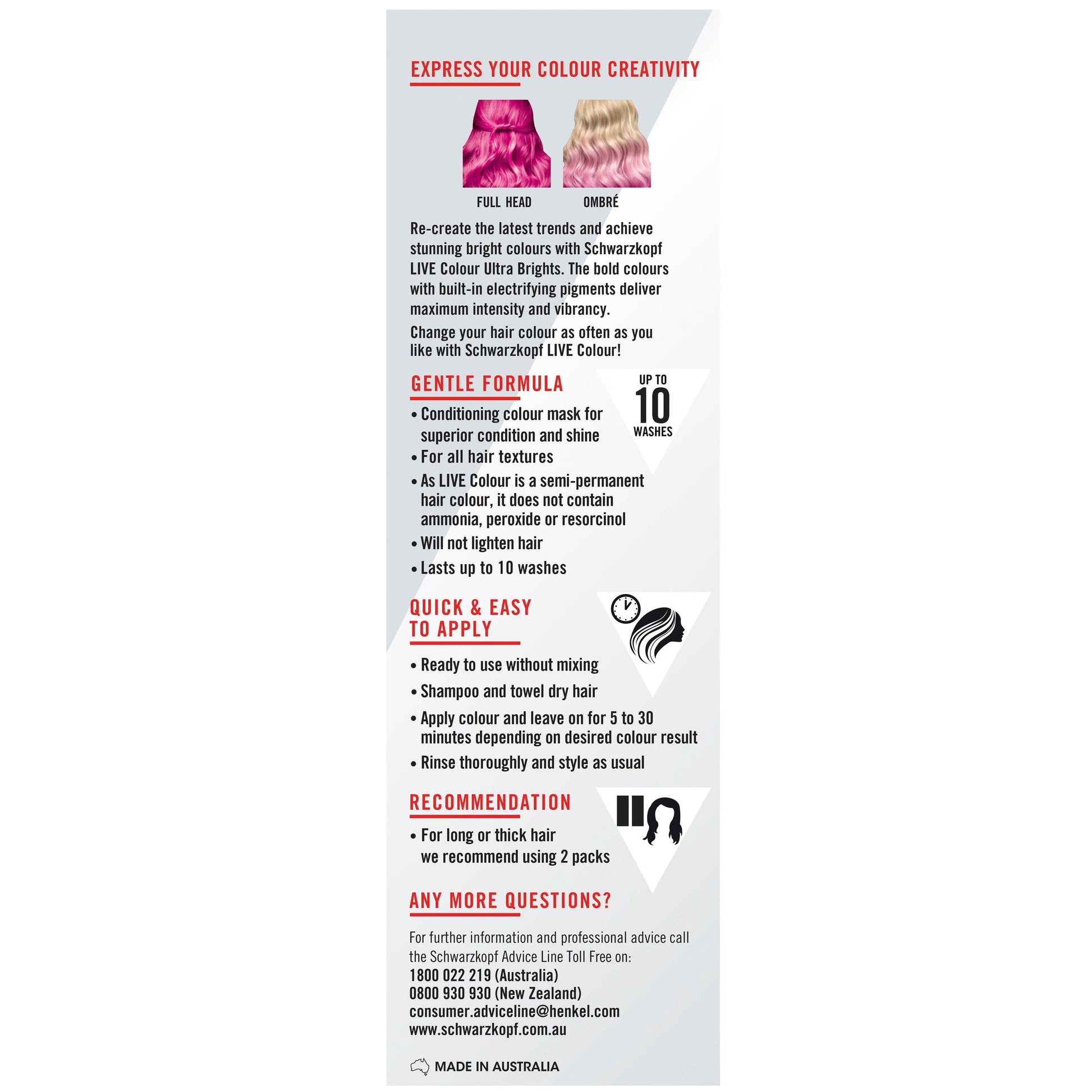 LIVE Colour Ultra Brights can be used on the full head or to achieve a dip dye look. LIVE Colour is an enriching colour mask that adds condition and vivid shine to your hair in one easy step. Its gentle semi-permanent formula contains no peroxide or ammonia. It lasts up to 8 washes meaning you can change your hair colour as often as you like with Schwarzkopf LIVE Colour Ultra Brights.