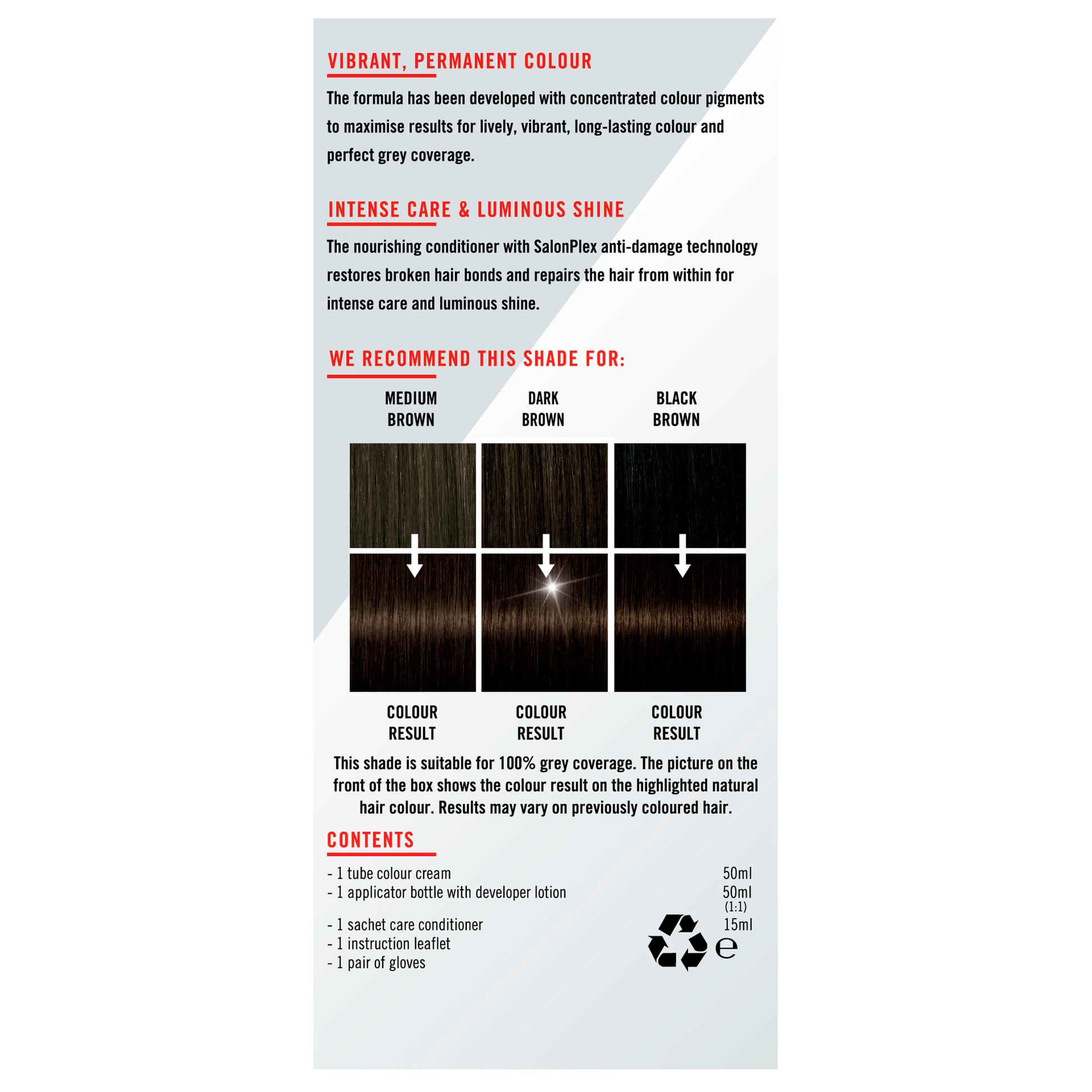 Boxed Contents: 1 tube caring colour creme 60mL, 1 application bottle with developer milk 60mL, 1 tube of colour-seal conditioner 22.5mL, 1 Instruction leaflet, 1 pair of gloves