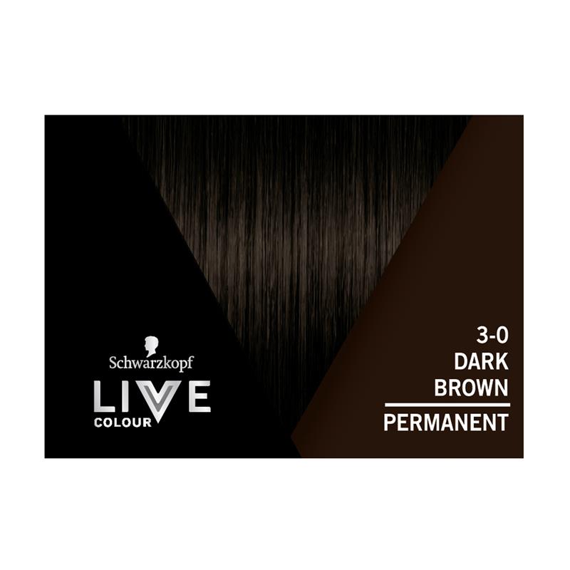Schwarzkopf Live Salon Permanent 3-0 Dark Brown provides grey coverage, intense 10-layer pigment penetration for lasting, radiant colour.
