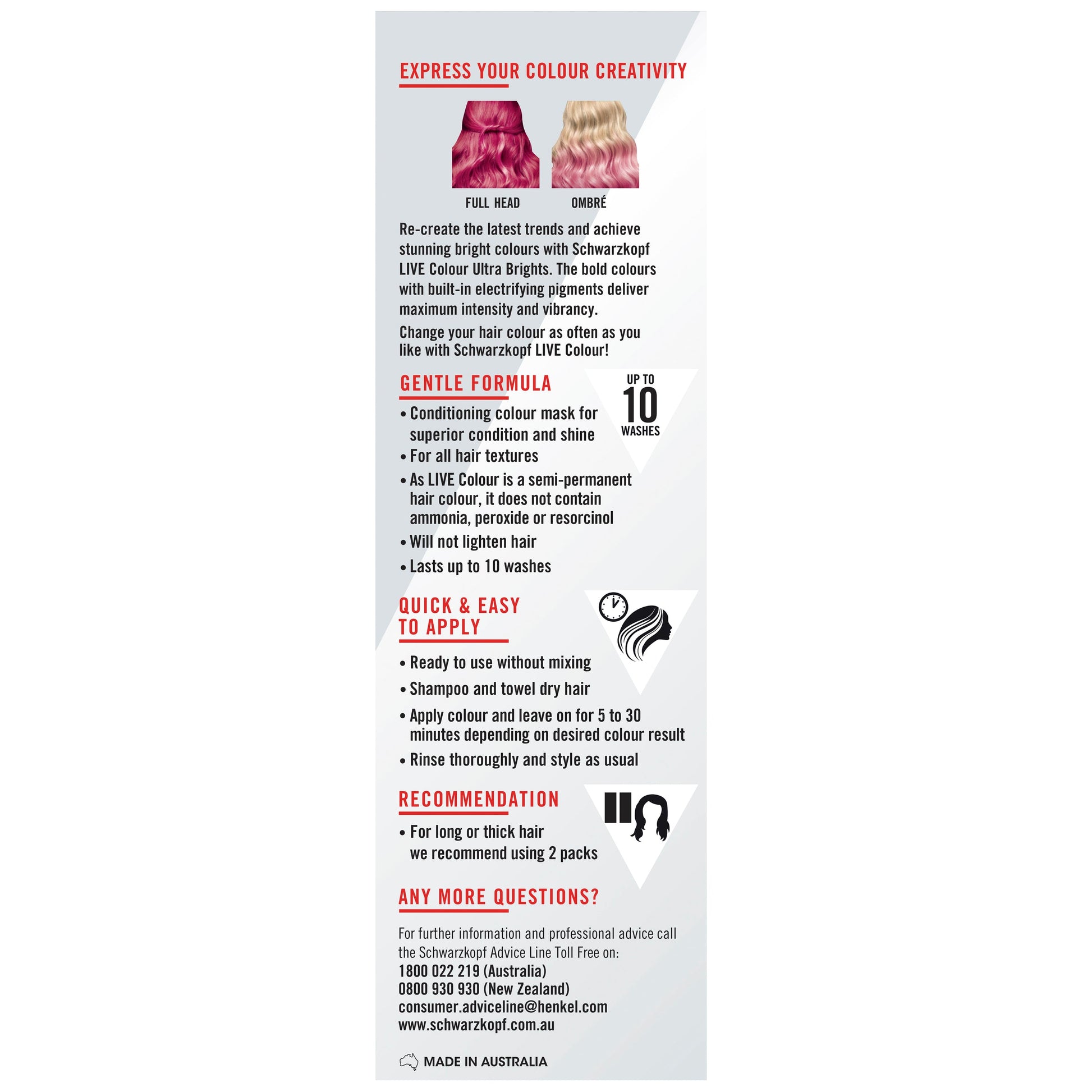 Schwarzkopf LIVE Colour Ultra Brights is a complete selection of semi-permanent, intense, bright and colourful shades. Itisammonia and peroxide free and lasts up to 10 washes.