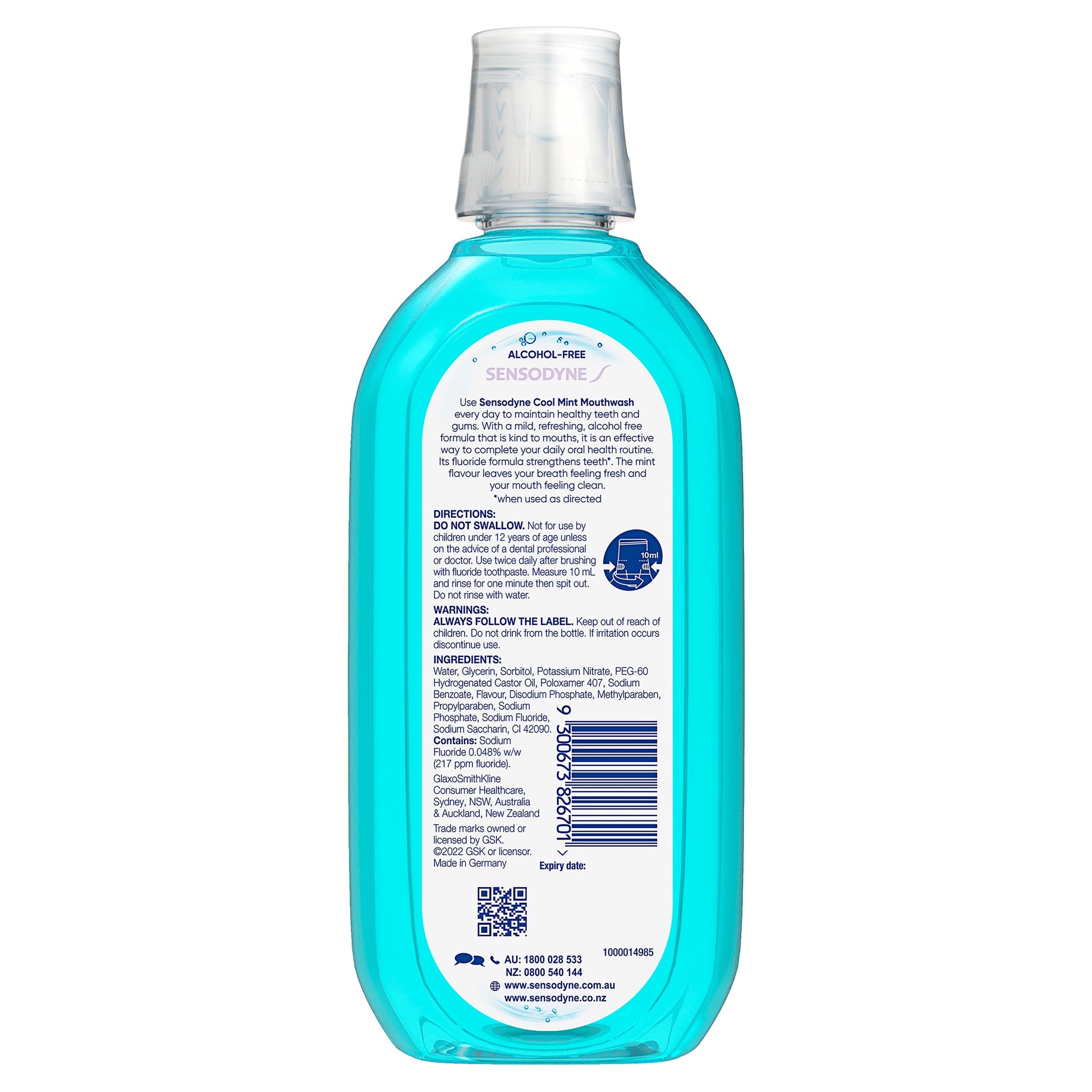 Use Sensodyne Sensitive Cool Mint Gentle Mouthwash everyday to maintain healthy teeth and gums. With a mild, refreshing, alcohol free formula that is kind to mouths, Sensodyne Sensitive Cool Mint Gentle Mouthwash is an effective way to complete your daily oral health routine. Its fluoride formula strengthens teeth (when used as directed). The mint flavour mouthwash leaves your breath feeling fresh and your mouth feeling clean.