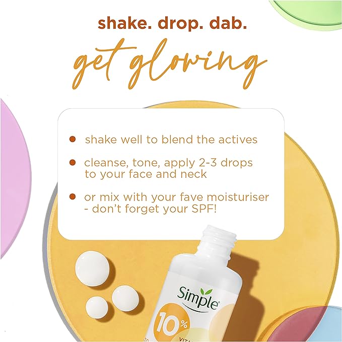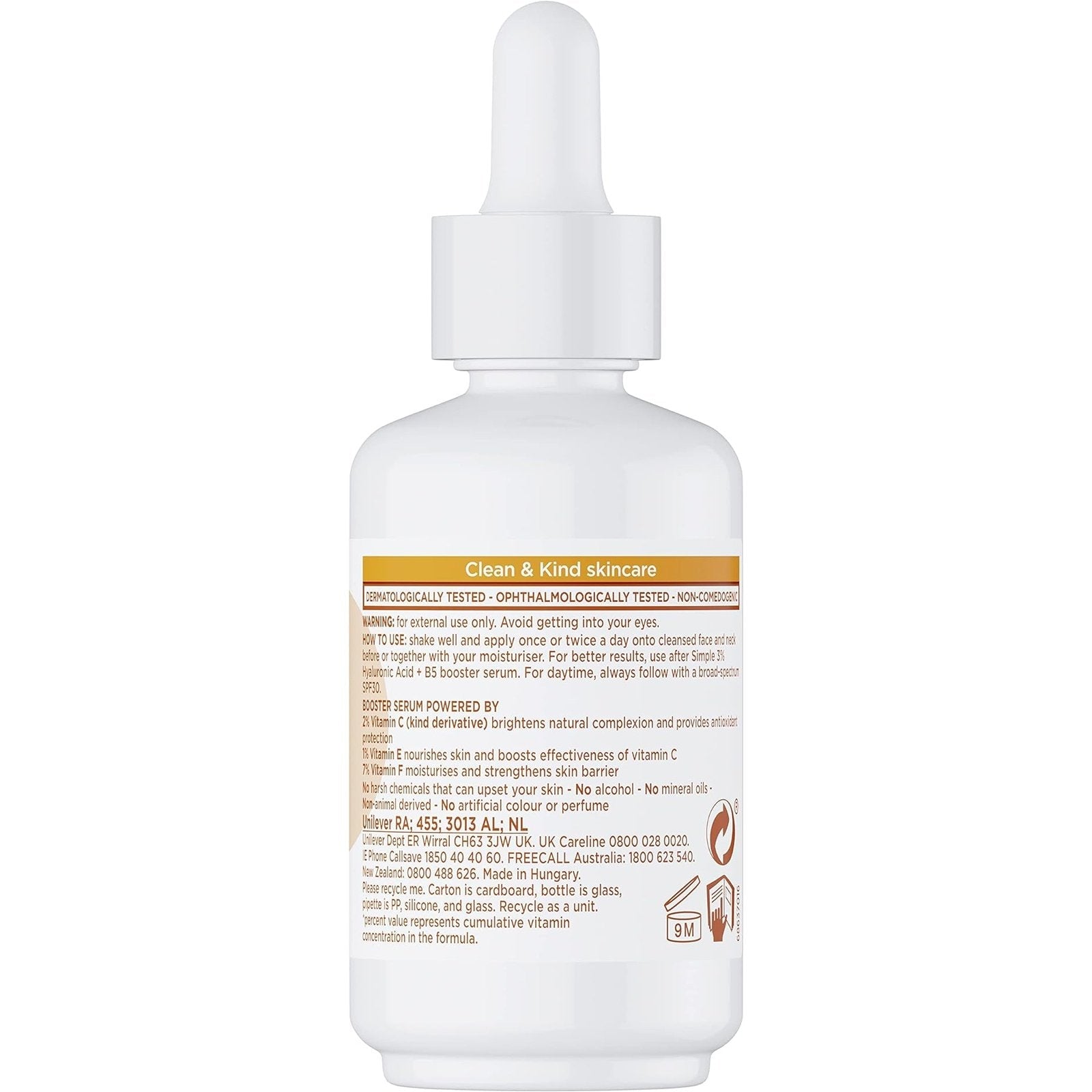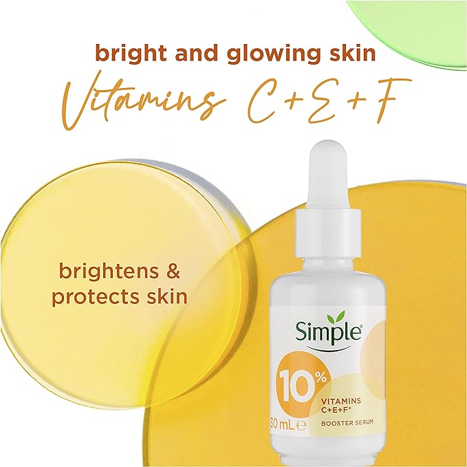 Antioxidant vitamin C gets glowing reviews for good reason. It’s naturally brilliant at brightening your complexion and protecting against environmental aggressors like pollution and blue light. Our new Booster Serums are powered by high-performance ingredients to supercharge your skincare routine for instant, visible results. Packed with 10% active ingredients, this booster contains 2% of a skin-kind derivative of vitamin C that won’t irritate your dry skin (or sensitive skin). 1% vitamin E boosts the effectiveness of vitamin C and nourishes your skin, while 7% vitamin F moisturises and strengthens your skin barrier. Containing 95% naturally derived ingredients, it's safe for every skin type. Our kind-to-skin promise? Like all Simple products, our Booster Serum is dermatologically tested, non-comedogenic, contains no harsh chemicals that can upset your skin and are free from alcohol, mineral oils, artificial colours and perfume. This Simple product is PETA-approved vegan. Shake, drop, dab – it's that simple. After using a cleanser, apply our non-sticky, non-greasy serum alone or mix a few drops into your favourite moisturiser for a super-quick vitamin C boost. Oh, and it’s fab under makeup too. Try cock tailing our 10% Vitamins C + E + F Booster Serum with our 3% Hyaluronic & Vitamin B5 Booster Serum (a few drops of each) in the morning, and don't forget your SPF afterwards. The best part? Real people love it. 83% agreed their skin felt instantly smoother and softer, and 8 out of 10 liked how the Booster Serum felt. The stats don’t lie, so try it yourself – we always love to know what you think of our new products, so leave us a review.