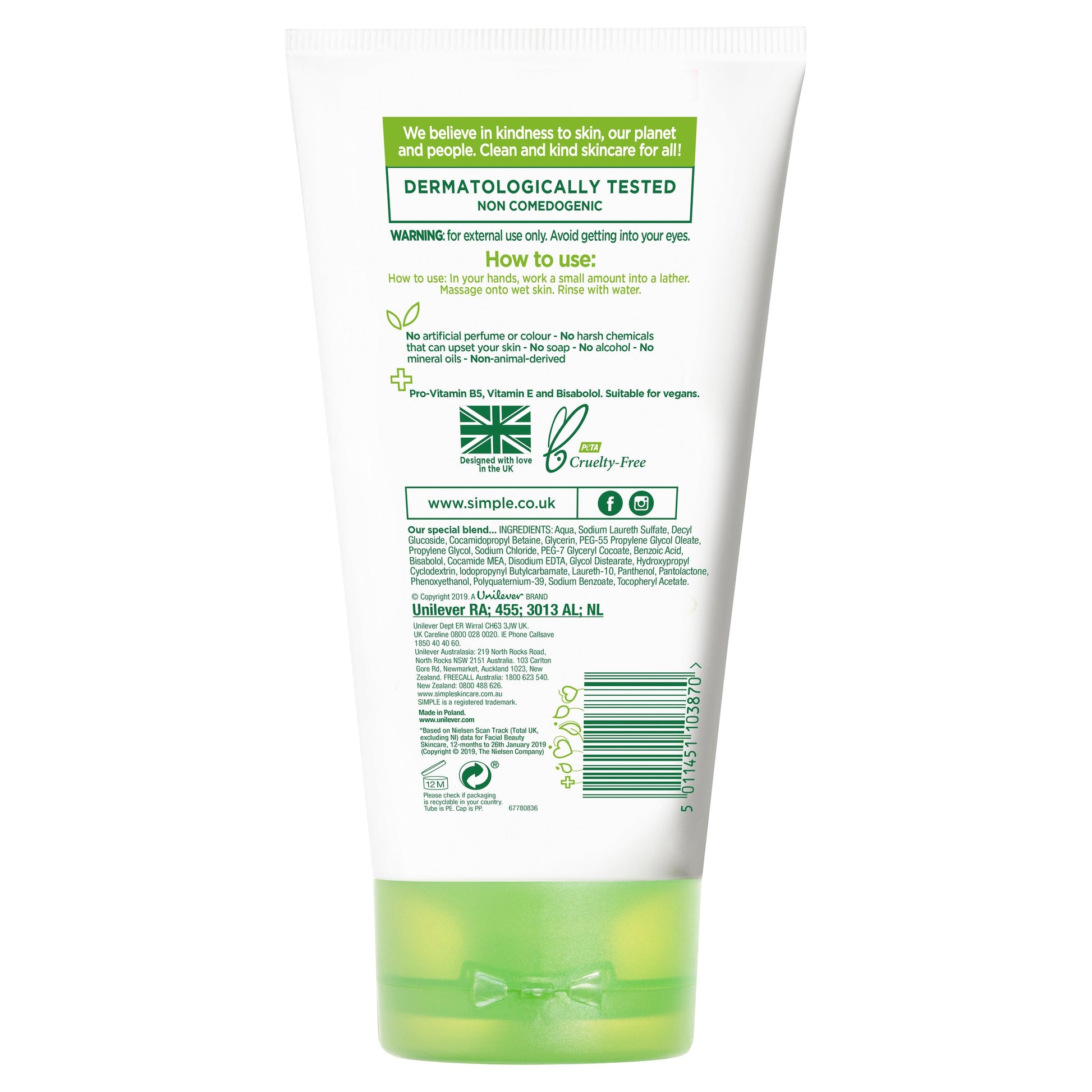 Who doesn't want to have clean and soft hydrated skin? Now you can with our Simple Kind to Skin Moisturising Facial Wash Gel. It hydrates while cleansing and exfoliating; washing away impurities without leaving your skin feeling tight or dry. It's TLC for your face. Our Simple face wash helps maintain the skin's natural barrier, which is so important when you're outside dealing with everyday pollution. Specially formulated for even the most sensitive skin, our facial wash contains no artificial perfume or colour, no alcohol, and no harsh chemicals that can upset your skin. Enriched with vitamin B5, which is known to actively restore, soften, and smooth skin; this skin cleanser is also perfect for dry skin. Our Simple wash formula doesn't clog pores, is hypoallergenic and it's safe to use around your eyes. It's 100% soap-free and, like all our Simple face products, this face wash is dermatologically tested. We believe in continuously working to be kinder to the planet. That's why this cleanser is vegan and Simple is certified cruelty-free by PETA, meaning we don't test on animals anywhere in the world. Want to know how to get the most out of your face wash? Use it in the morning and at night as part of your skincare routine, and don't forget to pay special attention to your hairline and the sides of your nose as that's where dirt and make-up can build up. It's always best to apply a toner and moisturiser after cleansing with a Simple face cleanser. For best results: Wet your face with warm water, squeeze a small amount into hands and massage gently in a circular motion onto wet skin. Rinse with warm water and pat dry. Result: feel fresh and zingy to face up to anything life throws at you!Boxed Contents: 150mL