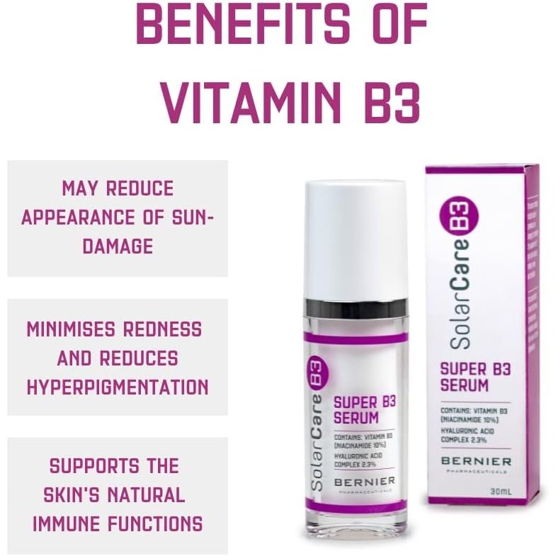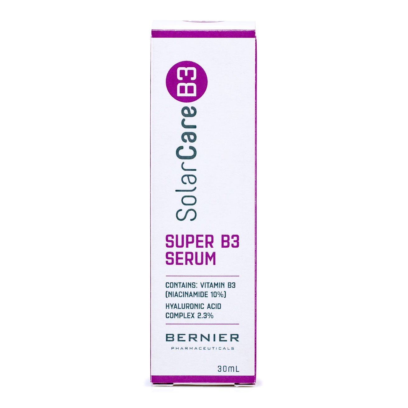 SolarCareB3 Super B3 Serum is the most powerful tool for repairing sun-damaged skin with twice the regular concentration of vitamin B3 (10% niacinamide) PLUS the power of 2.3% Hyaluronic Acid Complex, which hydrates and plumps for healthier looking skin and reduced appearance of sun damage and visible signs of ageing.
