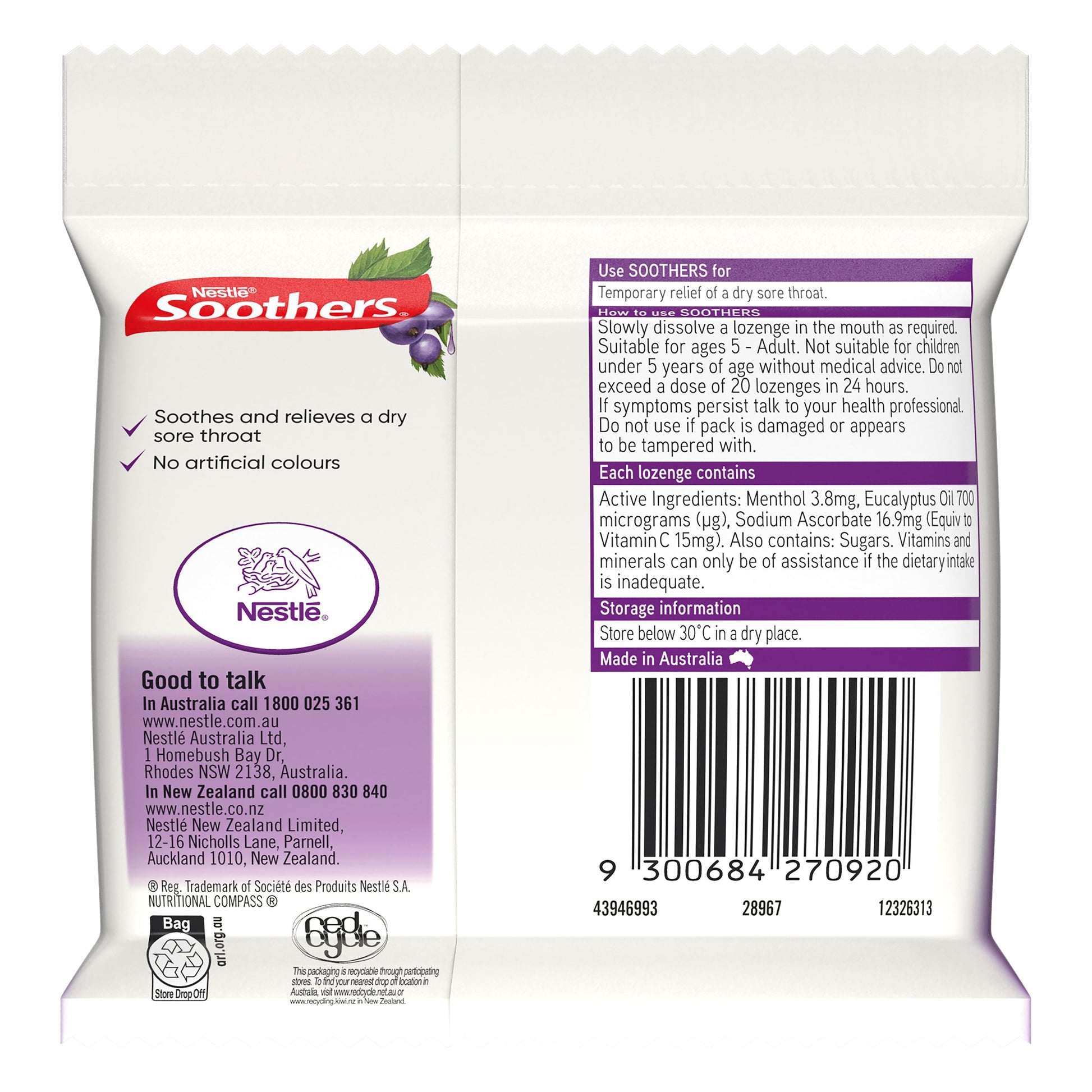 SOOTHERS Blackcurrant flavour medicated throat lozenges contain active ingredients Menthol, Eucalyptus Oil and Vitamin C for soothing throat relief. They help relieve symptoms of common colds and flu, including dry and irritated throats, and nasal congestion.