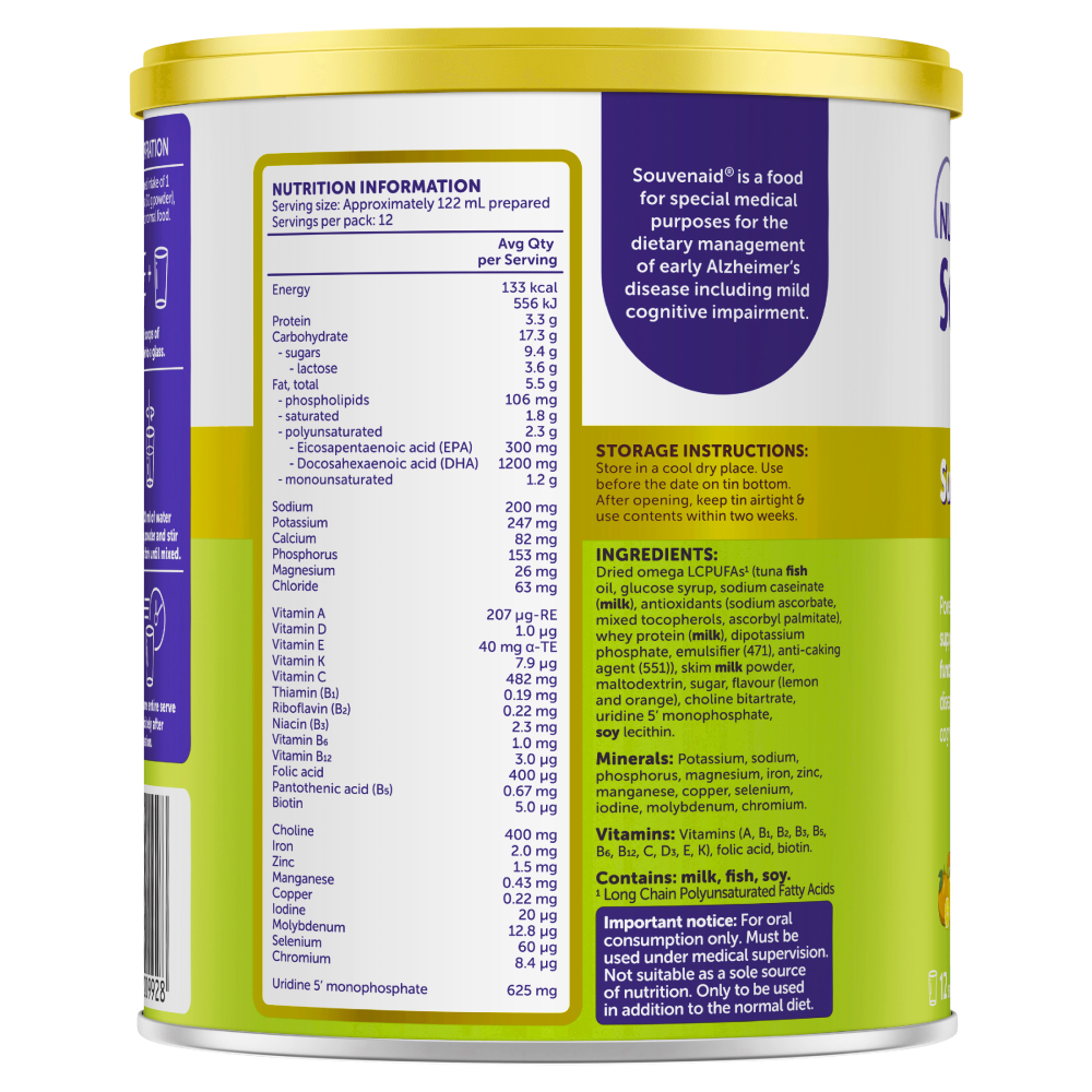 Souvenaid is food for special medical purposes for the dietary management of early Alzheimer's disease, including mild cognitive impairment. Important notice: For oral consumption only. Must be used under medical supervision. Not suitable as a sole source of nutrition. Only to be used in addition to the normal diet.