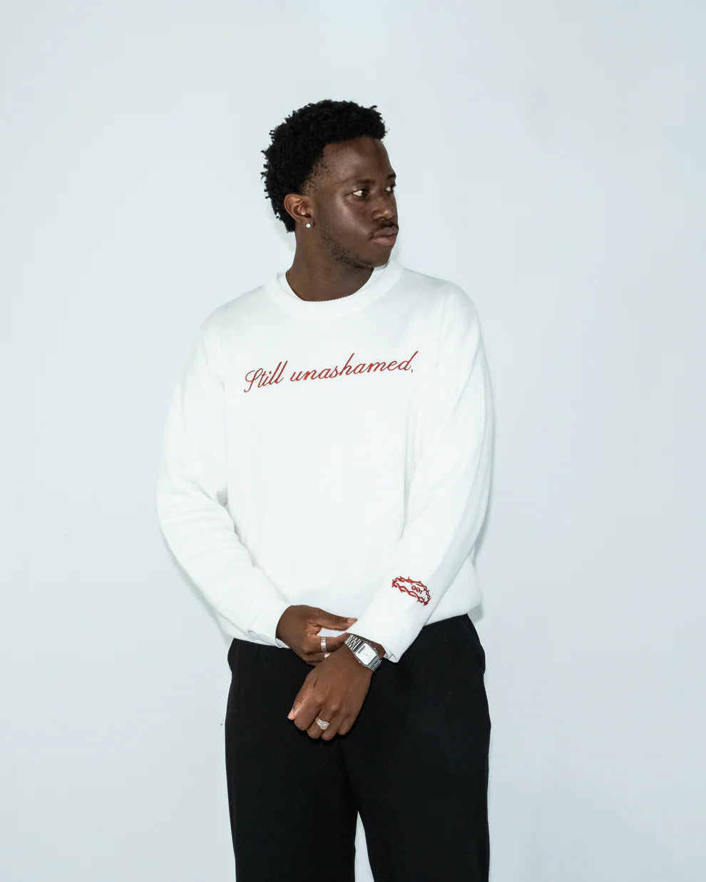 Crafted from 100% premium cotton, this white sweater blends minimalist design with powerful meaning. The front embroidery reads “Still Unashamed”, while the back features the face of Jesus, both stitched in red thread, symbolising the blood of Christ shed for our freedom.