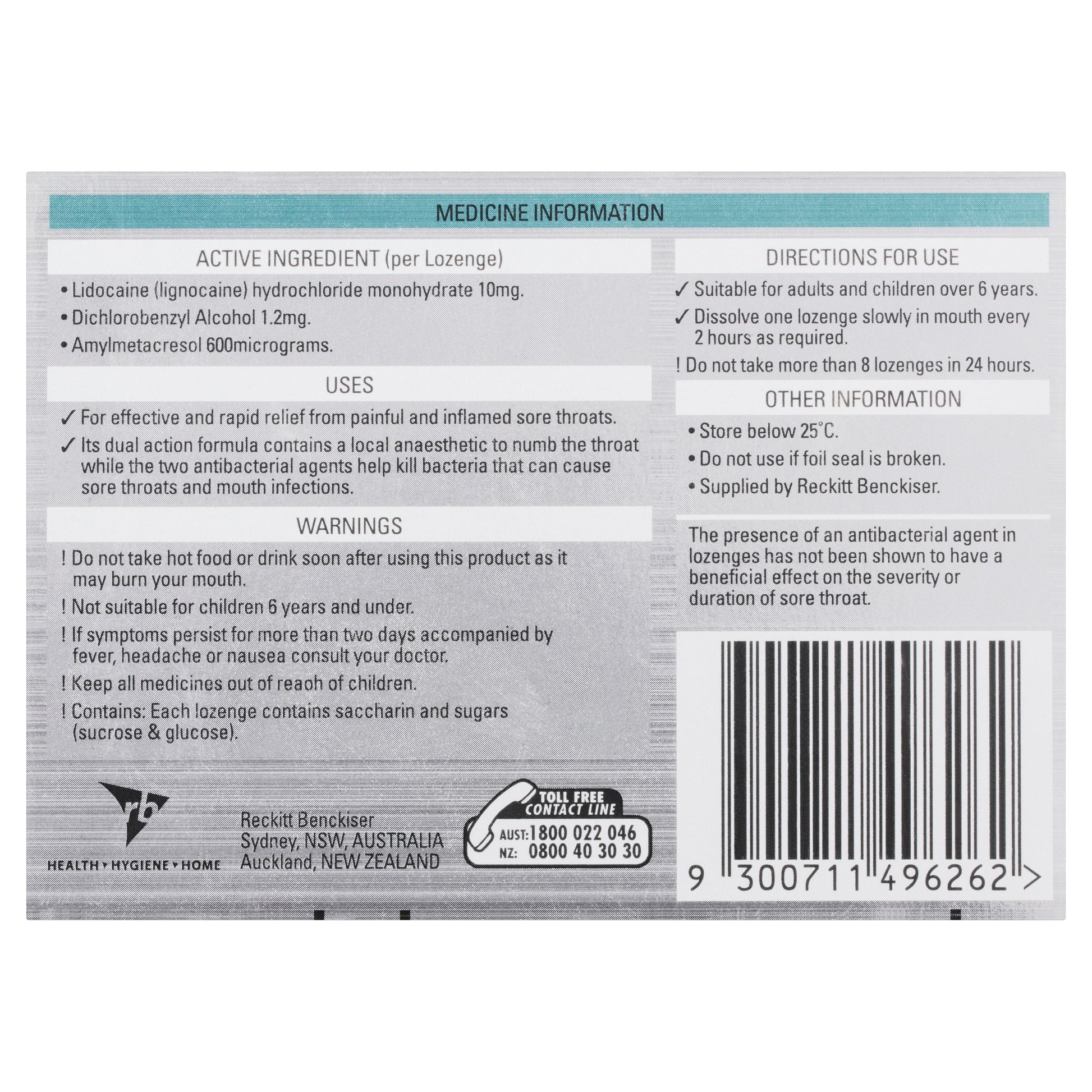 Lozenges for painful sore throats and mouth infections. Numbs the throat. Dual Action: 2 Antibacterial Agents + Anaesthetic.