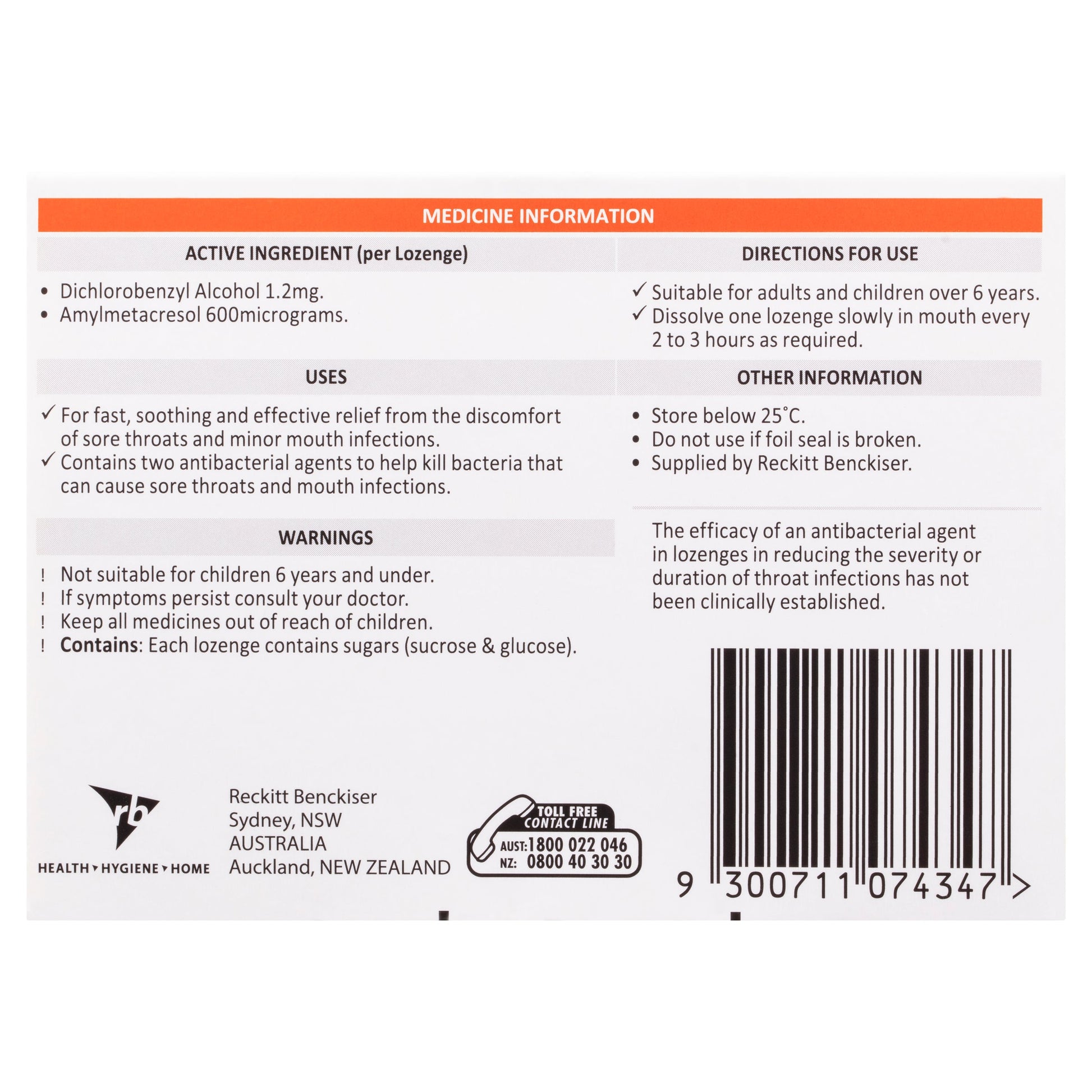 Contains: Each lozenge contains: Dichlorobenzyl Alcohol 1.2mg and Amylmetacresol 600µg. Each lozenge also contains Sucrose & Glucose.