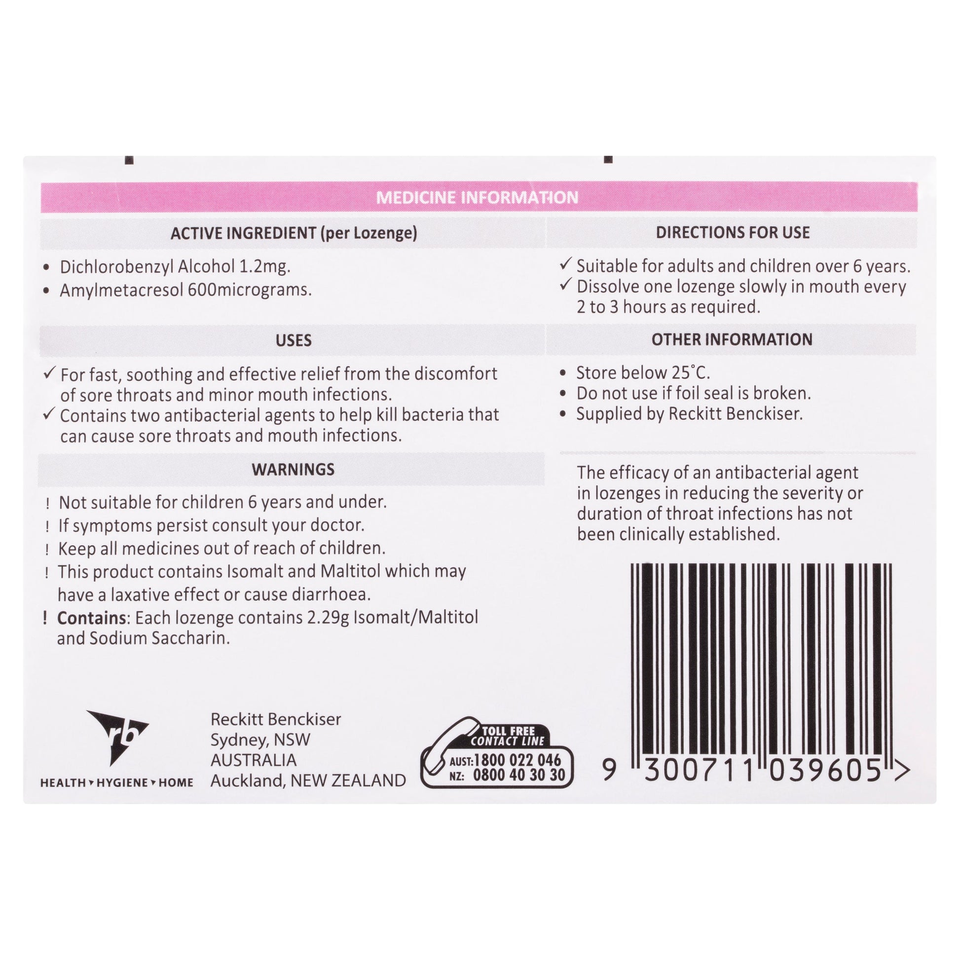 If you prefer a lozenge without sugar, try Strepsils Sugar Free Strawberry. These tasty little lozenges contain effective antibacterial agents (Dichlorobenzyl alcohol 1.2mg and Amylmetacresol 600µg) that relieve discomfort of a sore throat and minor mouth infections.