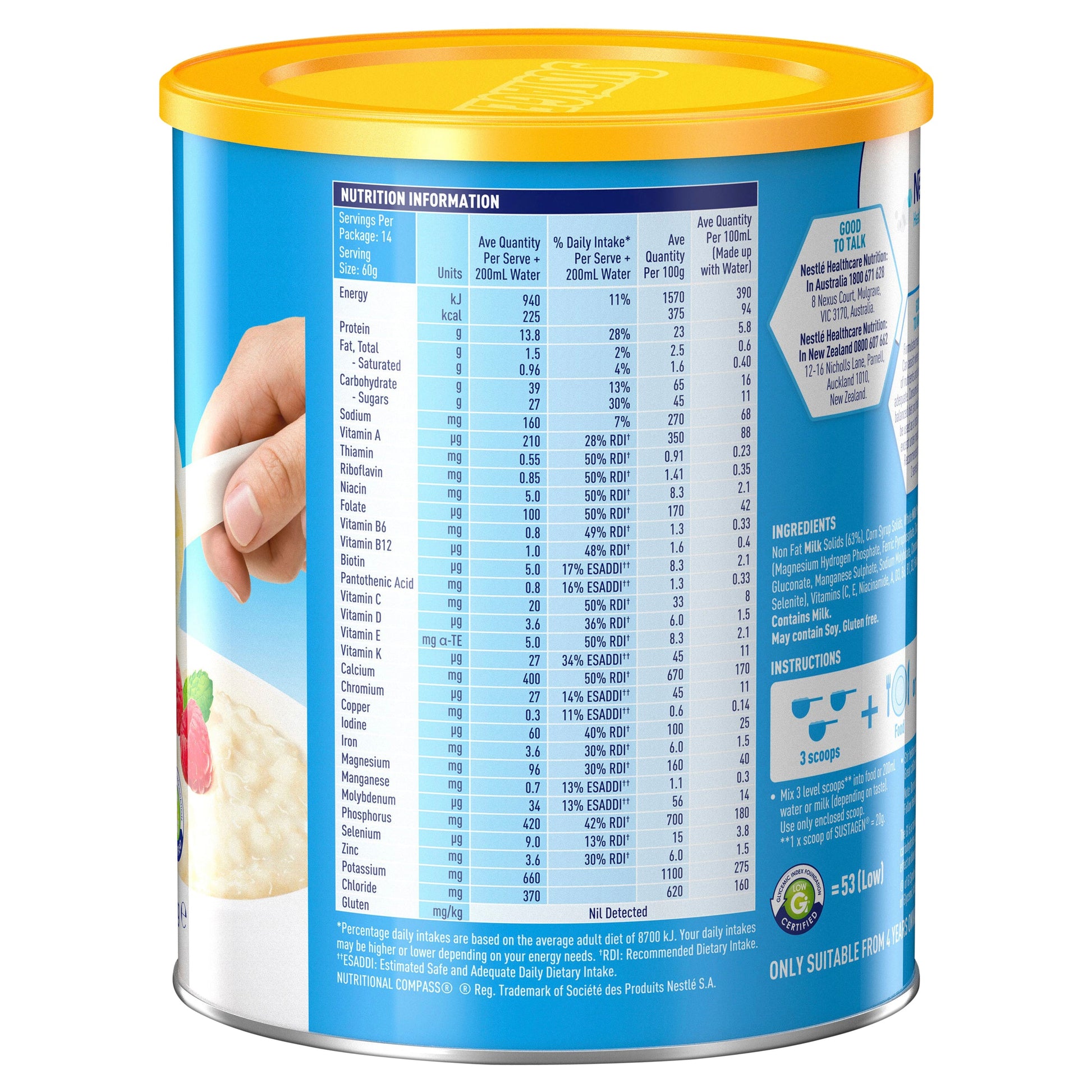Mix 3 level of scoops with water or milk (depending on taste). 1 scoop of Sustagen® = 20g Scoop included in can.
