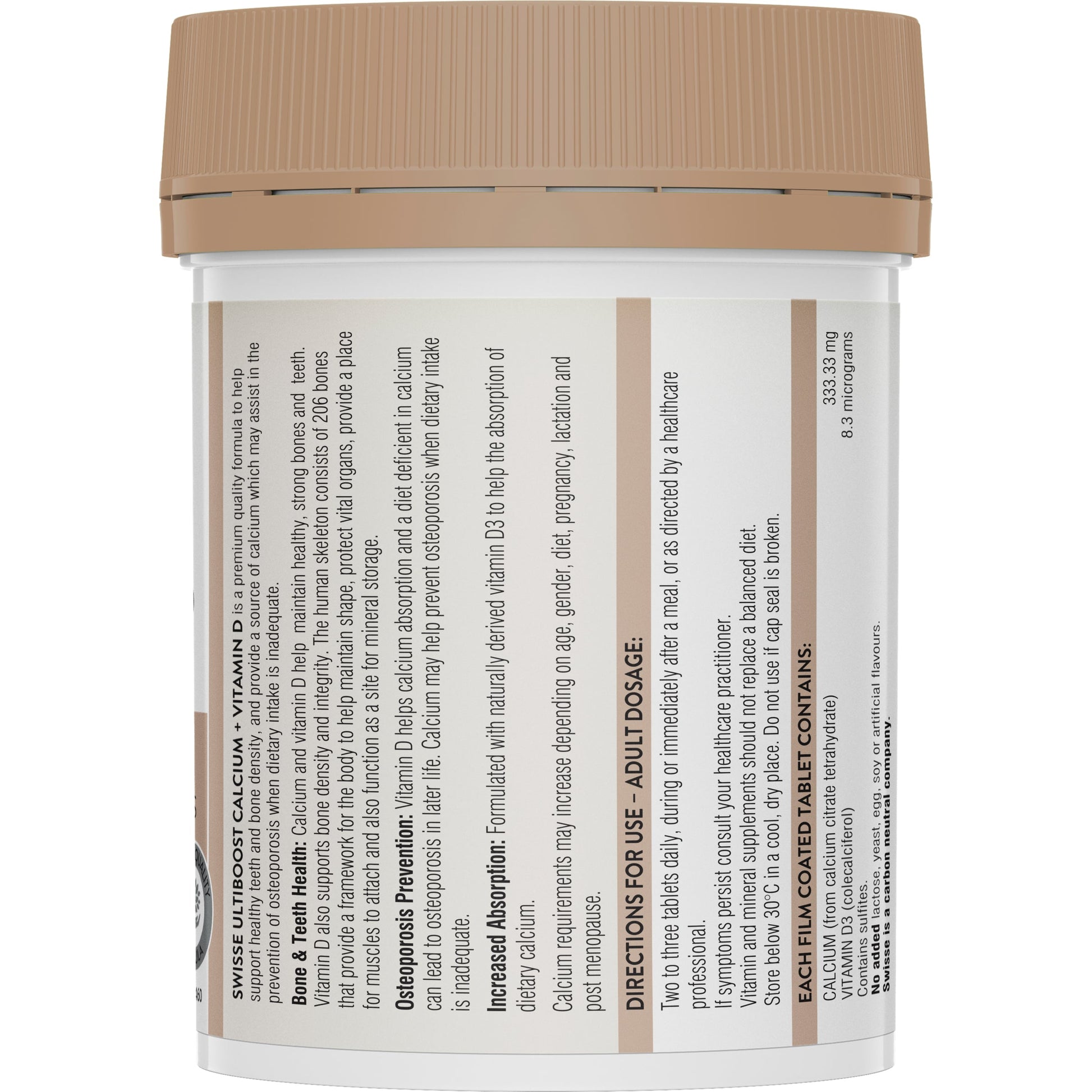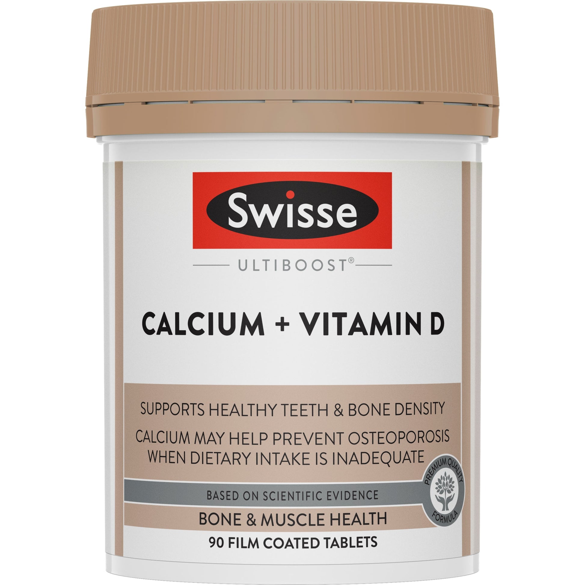 Swisse Ultiboost Calcium + Vitamin D contains premium quality ingredients to help support healthy bones and teeth. Swisse Ultiboost Calcium + Vitamin D contains a premium form of calcium (citrate) and natural vitamin D3 for increased calcium absorption. It also contains Bioperine, a unique standardised extract of black pepper.