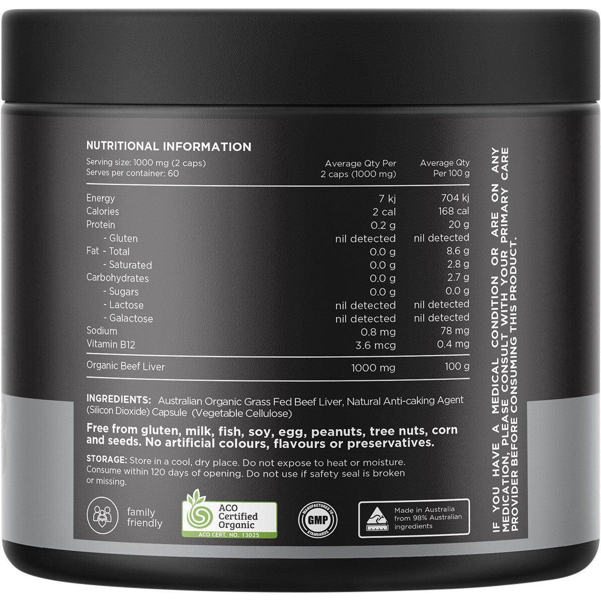 Australian Organic Grass Fed Beef Liver, Natural Anti-Caking Agent (Silicon Dioxide), Capsule (Vegetable Cellulose).