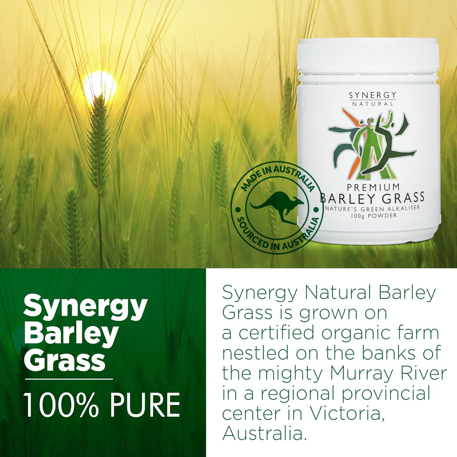 Synergy Barley Grass is 100% pure, whole-leaf Barley Grass powder (Hordeum vulgare). It is grown outdoors in an environmentally clean area of Australia in deep, rich soils. It contains no additives, fillers, colours or preservatives, and is handled sensitively during the growing, harvesting and processing of the plant to protect its nutrient profile.