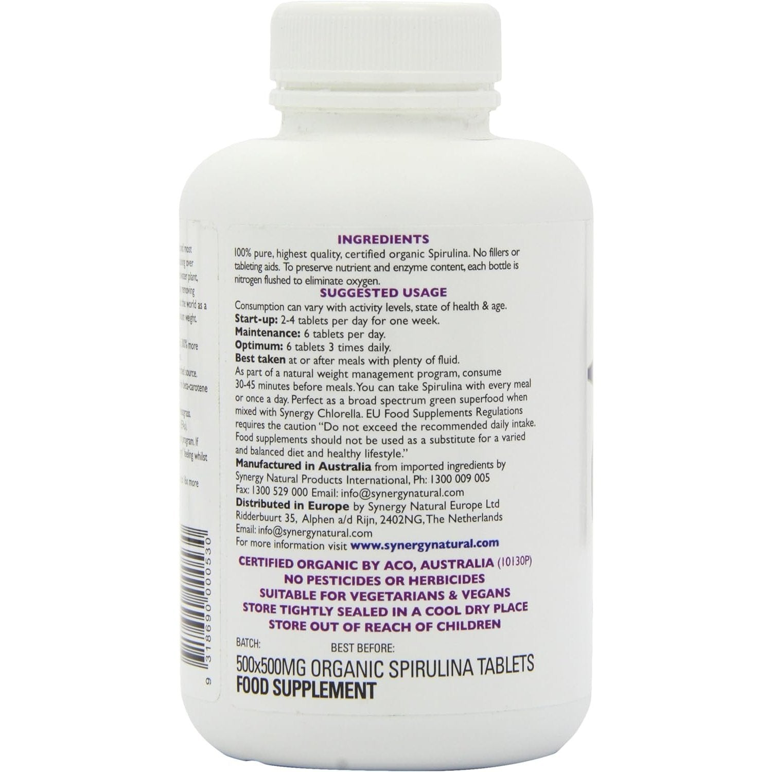 Optimum: 6 tablets, 3 times daily. Best taken at or after meals with plenty of fluid. As part of a natural weight management program, consume 30–45 minutes before meals. You can take Spirulina with every meal or once a day. Perfect as a broad spectrum green superfood when mixed with Synergy Chlorella.