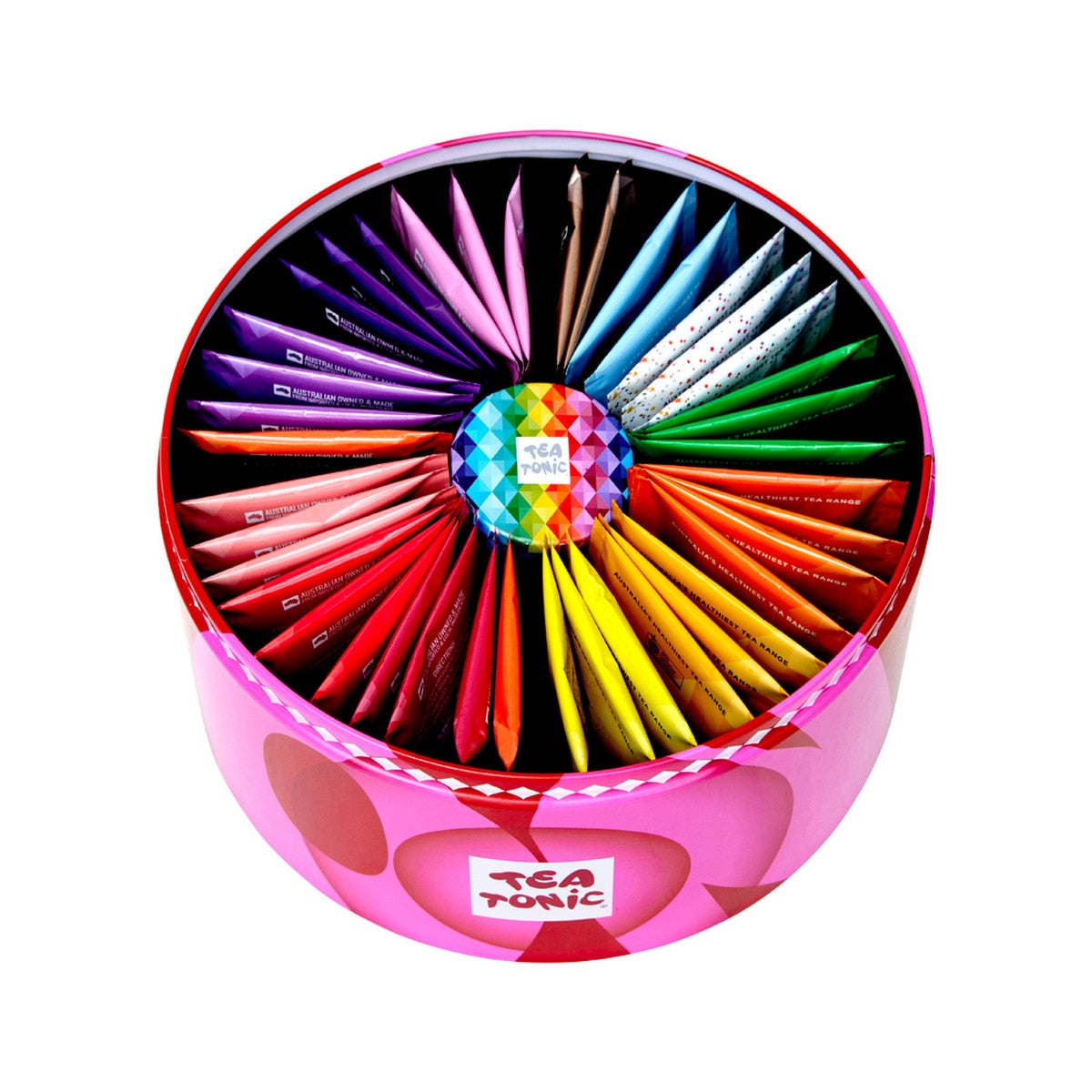 Discover the energizing benefits of Tea Tonic's selected teas with 40 tea bags in a round tin. This pack also includes a bonus mini tin of red hearts, making it the perfect gift for tea lovers. With a variety of tea blends, experience the invigorating effects of our energizing selection.