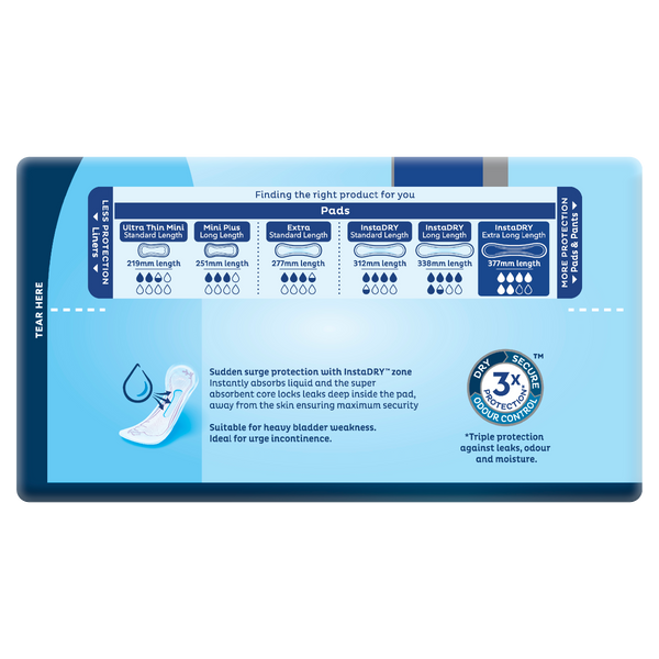 TENA InstaDRY Long Length pad is our fastest absorbing incontinence pad. Designed to be longer than the InstaDRY Standard Length, this pad is ideal for moderate to heavy urge incontinence and for those who want additional security and protection from bladder leaks.