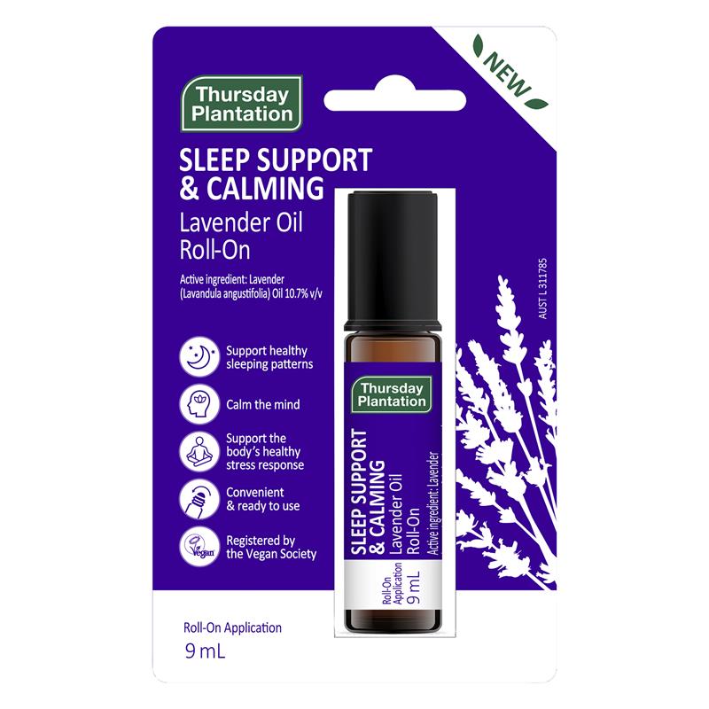 Thursday Plantation Sleep Support & Calming Lavender Oil Roll-On, a concentrated blend of 100% Pure Lavender Essential Oil infused in fractionated Coconut Oil.
