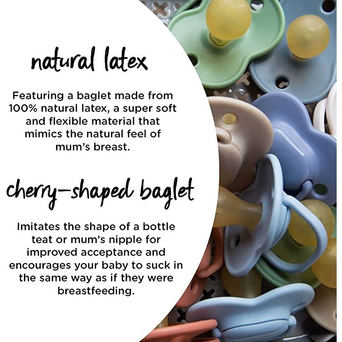 Tommee Tippee Decorated Latex Super Soft Soothers features a cherry shaped air vented teat and are BPA free.
