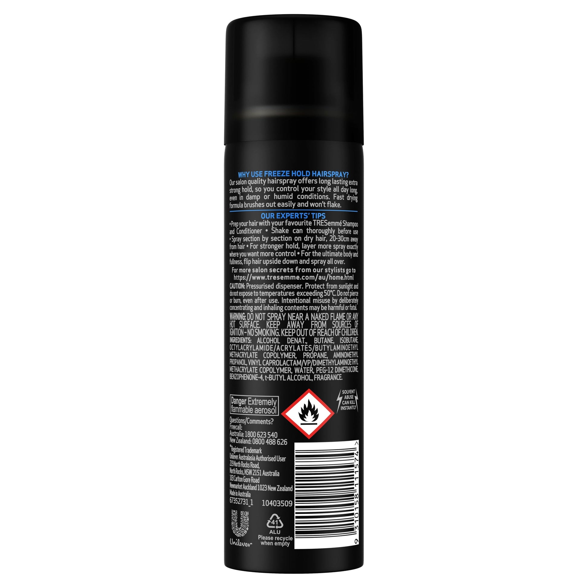 • TRESemme Salon Finish Freeze Hold Hairspray fully secures your look.• Never sticky or tacky to touch.