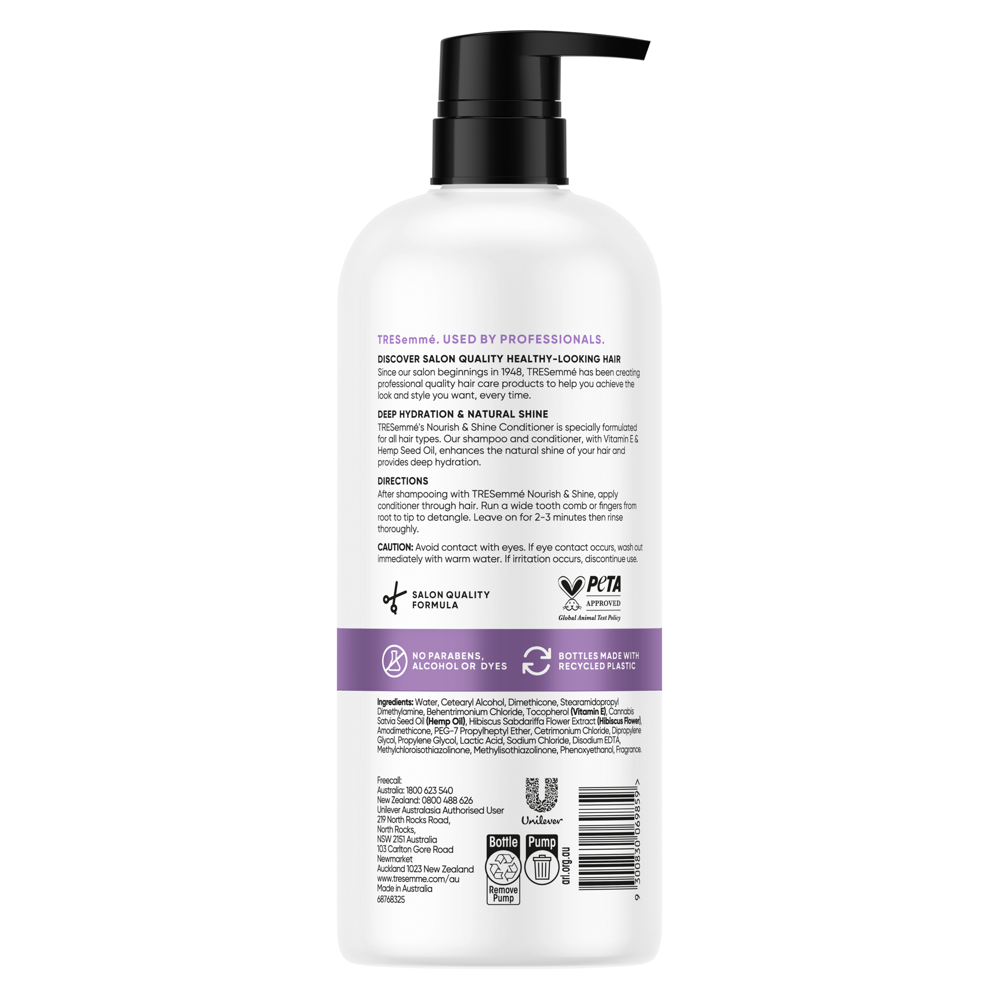 TRESemme's Nourish & Shine Conditioner is specially formulated for all hair types. Our shampoo and conditioner, with vitamin E and hemp Seed Oil, enhances the natural shine of your hair and provides deep hydration. Free from parabens, alcohol, and dyes, this conditioner is gentle enough for daily use and delivers intense hydration to where your hair needs it most. Since our salon's beginnings in 1948, TRESemme has been creating professional quality hair care products to help you achieve the look and style you want, every time. TRESemme understands how great hair gives you the confidence to walk taller every day. Inspired by stylists and tested in salons, the products are designed to help you achieve salon gorgeous hair every day. They are salon-quality formulas without the salon price tag. TRESemme does not test on animals and is PETA-approved worldwide. Bottles are made in Australia, with 50% Australian Recycled Plastic and are recyclable. Directions: After shampooing with TRESemme Nourish & Shine, apply conditioner through the hair. Run a wide tooth comb or fingers from root to tip to detangle. Leave on for 2–3 minutes then rinse thoroughly then style with your favourite TRESemme products. For more secrets from our professional stylists and details on TRESemme styling appliances & tools, visit www.tresemme.com.au Professional quality at your fingertips. Can cause eye irritation. In case of contact with eyes, rinse thoroughly with water.