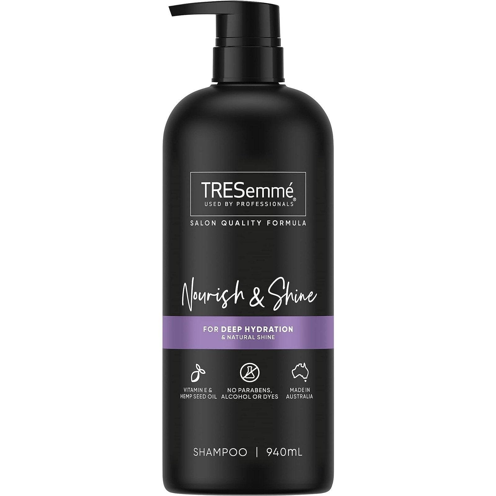 TRESemme's Nourish & Shine Shampoo is specially formulated for all hair types. Our shampoo and conditioner, with vitamin E and hemp Seed Oil, enhances the natural shine of your hair and provides deep hydration. Free from parabens, alcohol, and dyes, this shampoo is gentle enough for daily use and delivers intense hydration to where your hair needs it most. Since our salon's beginnings in 1948, TRESemme has been creating professional quality hair care products to help you achieve the look and style you want, every time. TRESemme understands how great hair gives you the confidence to walk taller every day. Inspired by stylists and tested in salons, the products are designed to help you achieve salon gorgeous hair every day. They are salon-quality formulas without the salon price tag. TRESemme does not test on animals and is PETA-approved worldwide. Bottles are made in Australia, with 50% Australian Recycled Plastic and are recyclable. Directions: Apply to wet hair, lather, then rinse thoroughly. Follow with Nourish & Shine Conditioner and style with your favourite TRESemme products. For more secrets from our professional stylists and details on TRESemme styling appliances & tools, visit www.tresemme.com.au Professional quality at your fingertips. Can cause eye irritation. In case of contact with eyes, rinse thoroughly with water