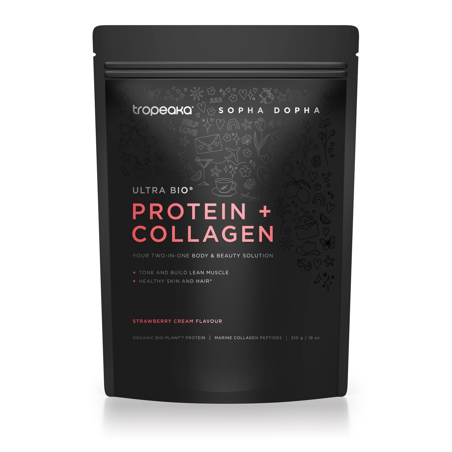 Discover the world's best beauty protein! Tropeaka x Sopha Dopha Protein + Collagen is your new 2-in-1 daily essential to help you tone & build lean muscle & support glowing skin! It's a complete body and beauty formula with a smooth, delicious taste! This high-absorption formula contains organic protein and premium marine collagen to help you reach your body and beauty goals!