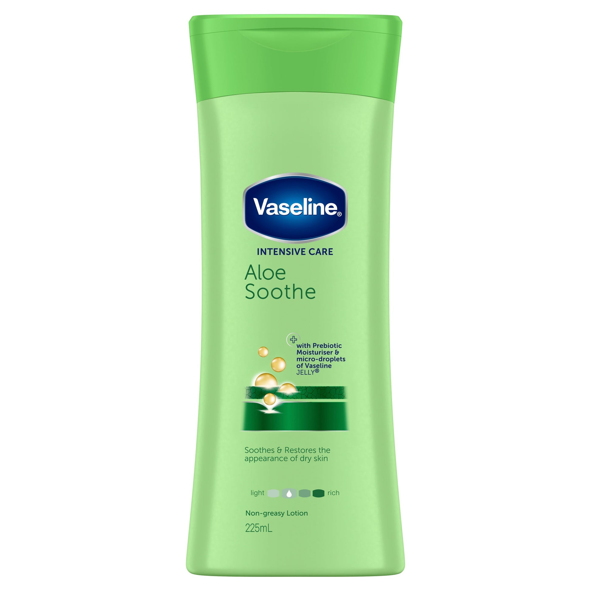 Vaseline Intensive Care Body Lotion Aloe Soothe 225ml, restores the appearance of dry skin. Vaseline Aloe Soothe Lotion soothes and restores the appearance of dry skin. We believe healthy skin starts with deep moisture. In our Intensive Care™ Aloe Soothe Lotion we've combined micro-droplets of Vaseline® Jelly with aloe vera in a refreshing, fast-absorbing formula. The result is a skin lotion that calms and soothes the discomfort associated with dry, irritated skin and leaves it feeling deeply moisturised. Within stratum corneum. Absorbs fast for a non-greasy feel. Vaseline® Petroleum Jelly is the original wonder jelly. Vaseline has long been used to manage symptoms of many severe skin conditions. It literally melts into the skin, flowing into the tiny cracks caused by dryness where moisture is needed most. In this way Vaseline acts as an extremely powerful skin moisturiser to provide a barrier against water loss from already dry skin and help protect against the effects of weather and exposure. Our petroleum jelly is triple-purified to be 100% pure. Vaseline® believes that truly healthy skin starts with deep moisture. It's not something you get by masking problems or through quick fixes. We know this because we are the original skin experts. Founded in 1870 by Robert Chesebrough, Vaseline® has been safely helping care for skin for over 140 years.Boxed Contents: 225mL