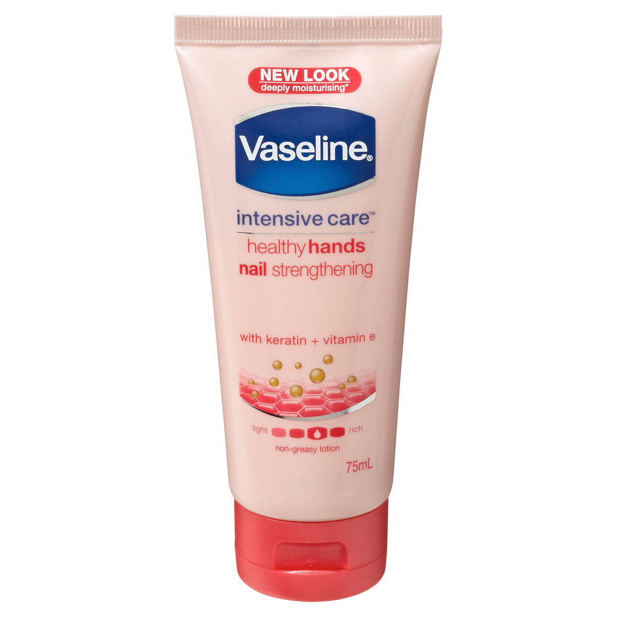 Vaseline Intensive Care Hand Cream for healthy hands and stronger nails, restores the appearance of very dry hands. Strengthen your nails and soften your hands with this keratin-enriched formula to penetrate into your nails helping to protect hands against moisture loss for hours. Our hands are often the first to suffer from dry skin, taking a battering from the sun, low humidity and harsh cleansers that chip away at the skin's natural barrier. In our Intensive Care™ Healthy Hands, Nail Strengthening formula, we've packed micro-droplets of Vaseline® Jelly with powerful moisturisers into a travel-friendly size to give you moisture on the go for very dry hands and help to stop your nails from breaking. Vaseline® Petroleum Jelly is the original wonder jelly. Vaseline has long been used to manage symptoms of many severe skin conditions. It literally melts into the skin, flowing into the tiny cracks caused by dryness where moisture is needed most. In this way Vaseline acts as an extremely powerful skin moisturiser to provide a barrier against water loss from already dry skin and help protect against the effects of weather and exposure. Our petroleum jelly is triple-purified to be 100% pure. Vaseline® believes that truly healthy skin starts with deep moisture. It's not something you get by masking problems or through quick fixes. We know this because we are the original skin experts. Founded in 1870 by Robert Chesebrough, Vaseline® has been safely helping care for skin for over 140 years.Boxed Contents: 75mL