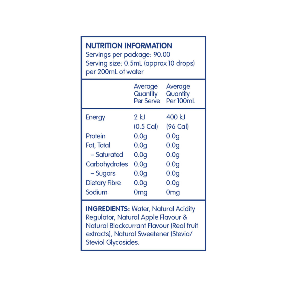 Water, Natural Acidity Regulator, Natural Apple Flavour & Natural Blackcurrant Flavour (Real fruit extracts), Natural Sweetener (Stevia/Steviol Glycosides)CPP