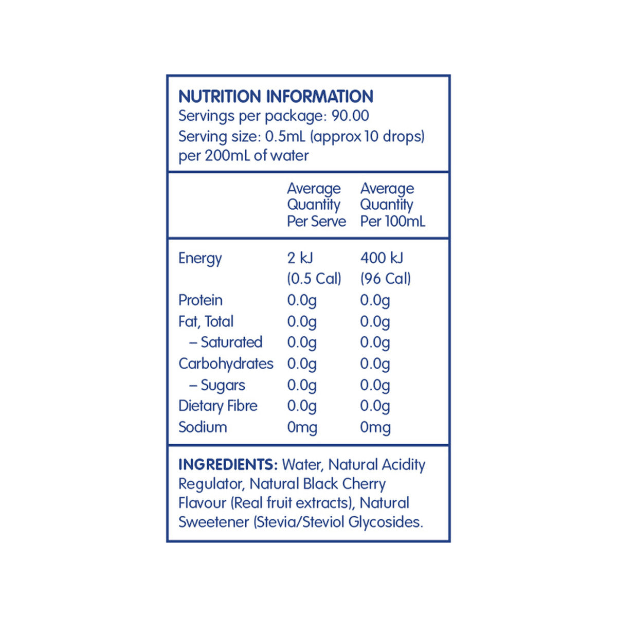 Water, Natural Acidity Regulator, Natural Black Cherry Flavour (Real fruit extracts), Natural Sweetener (Stevia/Steviol Glycosides)CPP