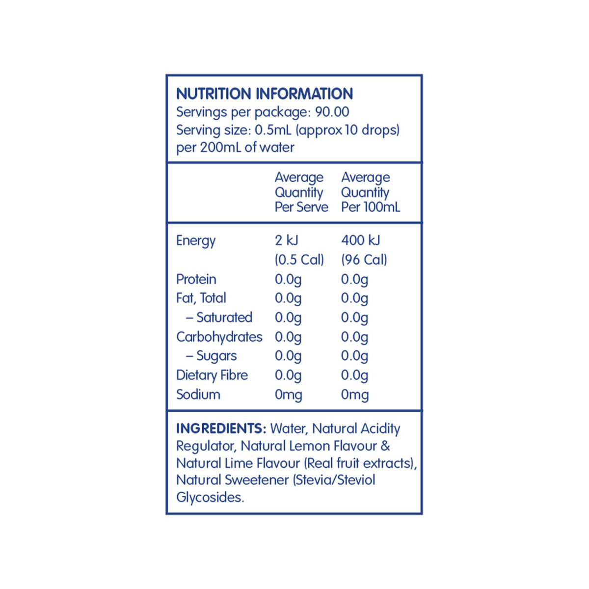 Water, Natural Acidity Regulator, Natural Lemon Lime Flavour (Real fruit extracts), Natural Sweetener (Stevia/Steviol Glycosides)CPP
