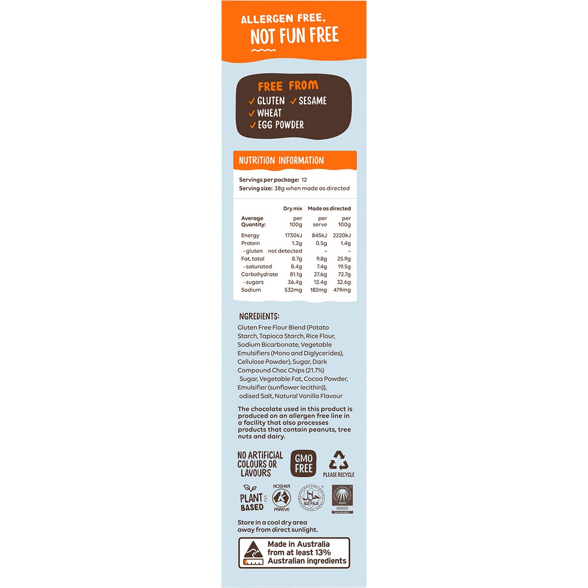 Gluten Free Flour Blend (Potato Starch, Tapioca Starch, Rice Flour, Sodium Bicarbonate, Vegetable Emulsifier (Mono and Diglycerides), Cellulose Powder), Sugar, Dark Compound Choc Chips (21.7%) (Sugar, Vegetable Fat, Cocoa Powder, Emulsifier (Sunflower Lecithin)), Iodised Salt, Natural Vanilla Flavour.