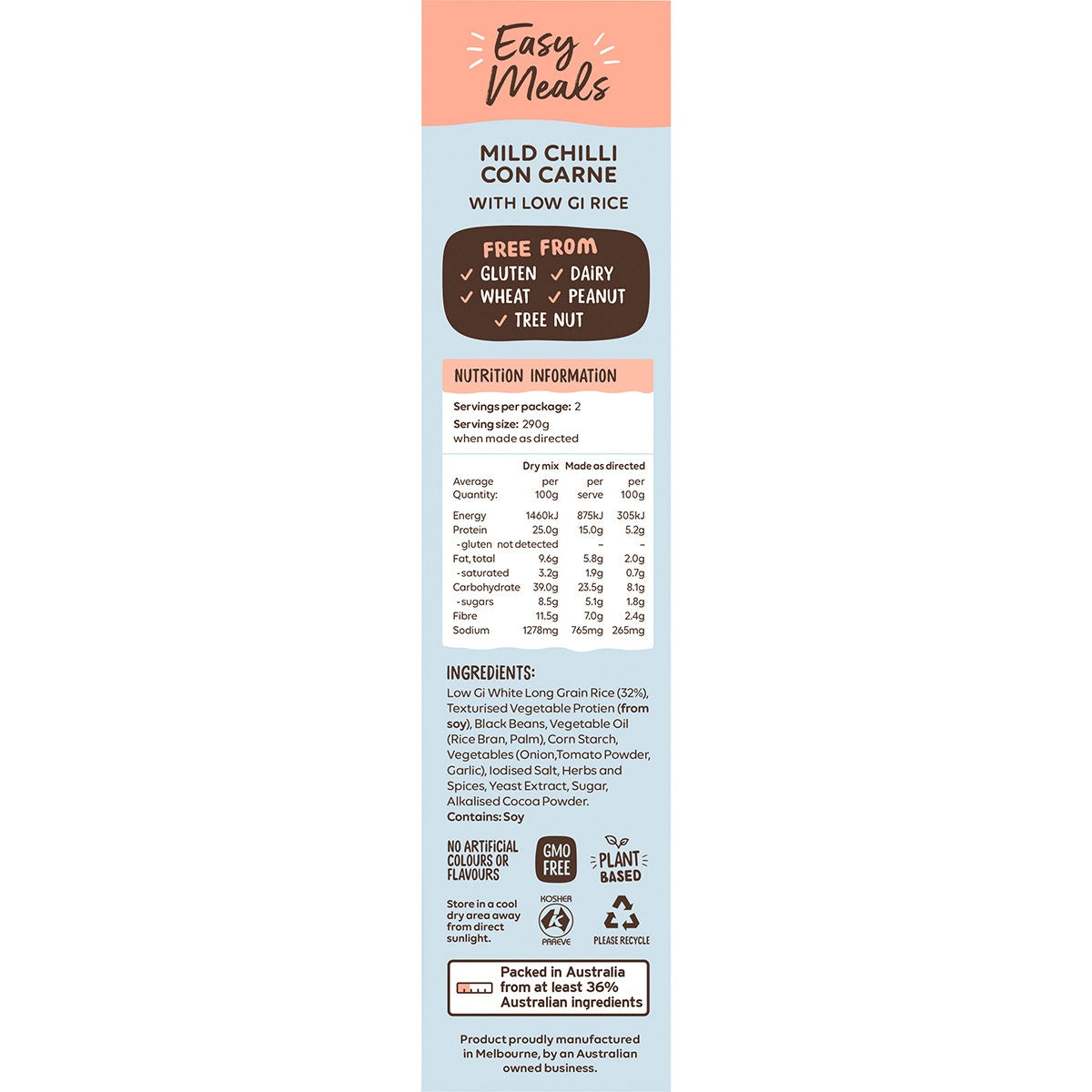 Low GI White Long Grain Rice (32%), Texturised Vegetable Protein (from Soy), Black Beans, Vegetable Oil (Rice Bran, Palm), Corn Starch, Vegetables (Onion, Tomato Powder, Garlic), Iodised Salt, Herbs and Spices, Yeast Extract, Sugar, Alkalised Cocoa Powder.