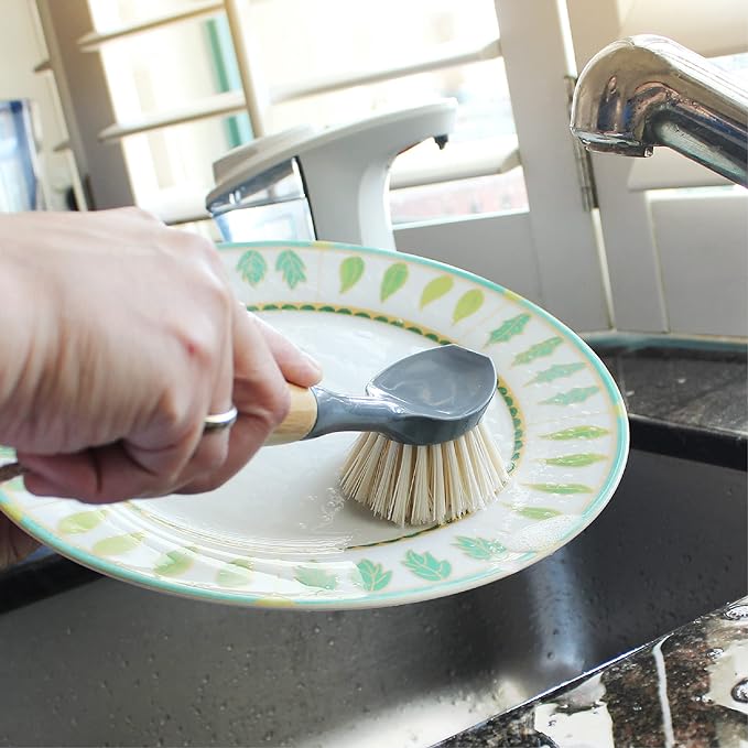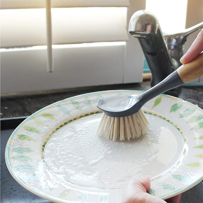 Make cleaning dishes in the sink easy with the Eco Basics Dish Brush. The elegant and effective design is made from bamboo, recycled plastic and soft recycled nylon bristles. The long handle and tapered head means your hands need not get wet. The flat end of the brush is perfect for chiselling off burnt in mess. The bristle will not scratch non-stick cookware.