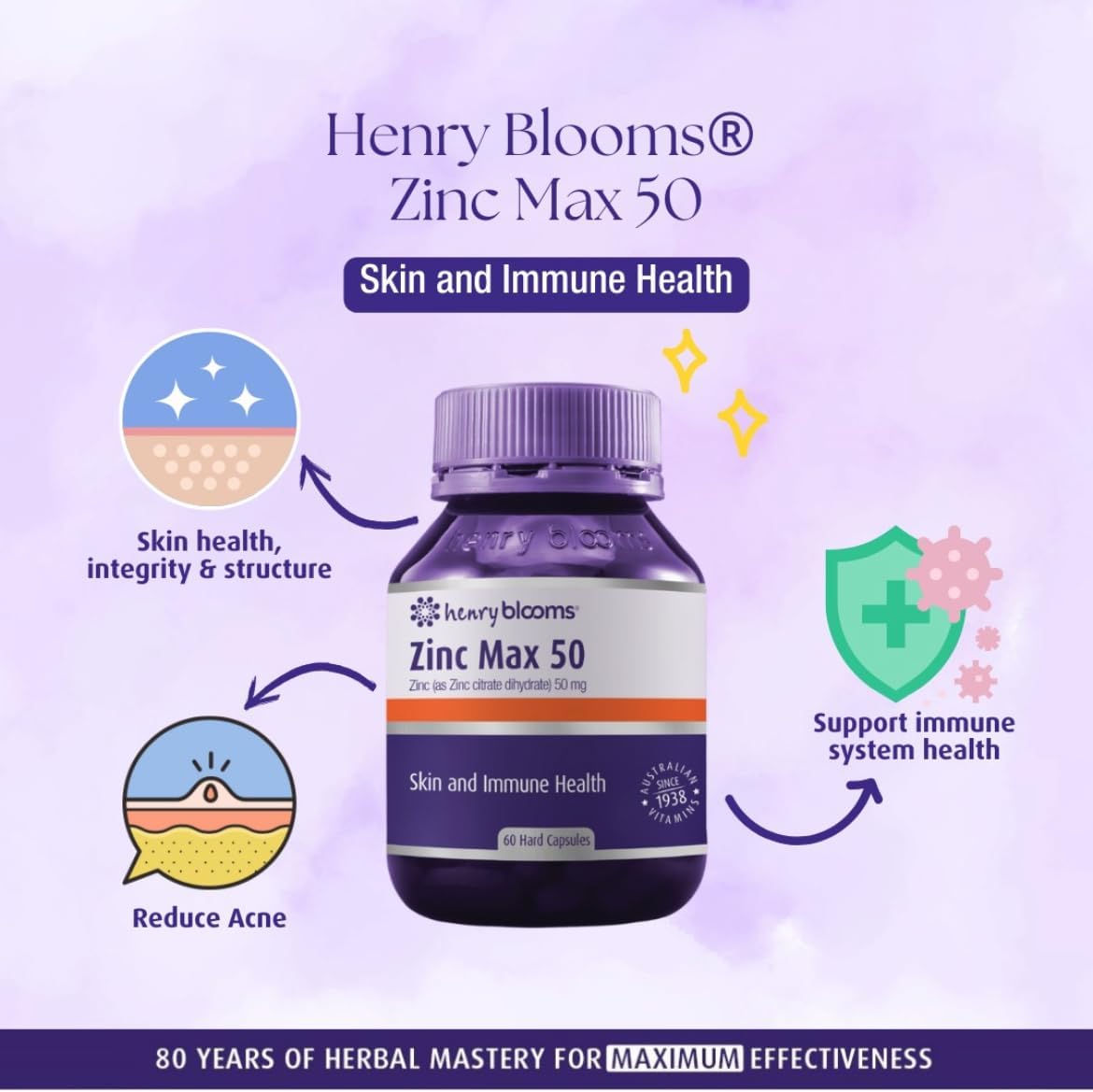 Henry Blooms Zinc Max 50 is a high strength, once a day Zinc supplement beneficial for development and proper functioning of the reproductive system, the immune system and skin repair. Zinc is essential for the formation of connective tissue, teeth, bones, nails, hair and skin and plays an important role in collagen formation. Zinc can also reduce the severity and duration of colds and support cardiovascular health.