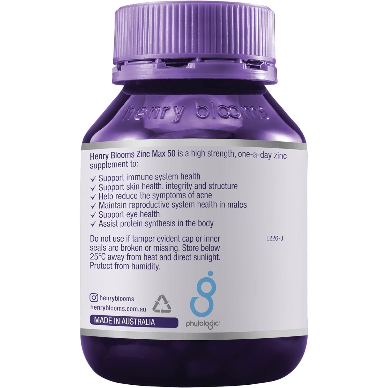 Henry Blooms Zinc Max 50 is a high strength, once a day Zinc supplement beneficial for development and proper functioning of the reproductive system, the immune system and the integumentary (skin) system. Zinc is essential for the formation of connective tissue, teeth, bones, nails, hair and skin as it plays an important role in collagen formation. Zinc can also assist in the management of mild to moderate acne and dermatitis.