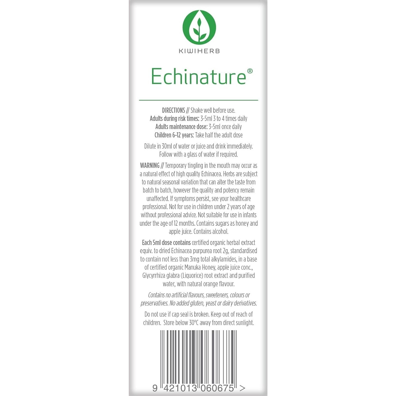 • Contains no artificial flavours, sweeteners, colours or preservatives. No added gluten, yeast or dairy derivatives.Echinacea purpurea root (organic) 1.2g / 3ml