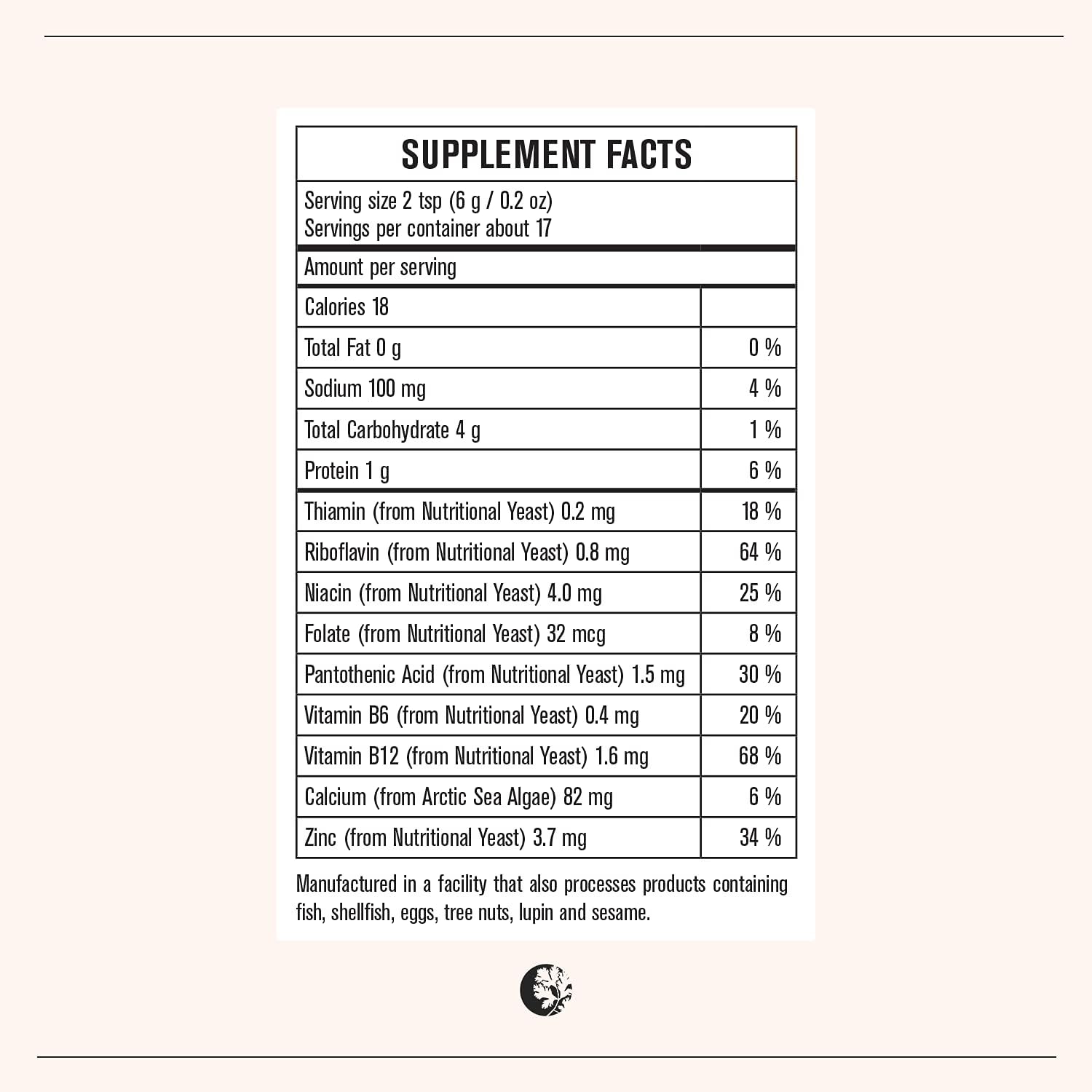 Contains Soy. Manufactured in a facility that also processes products containing tree nuts, milk, eggs, sesame, fish, shellfish and lupin.