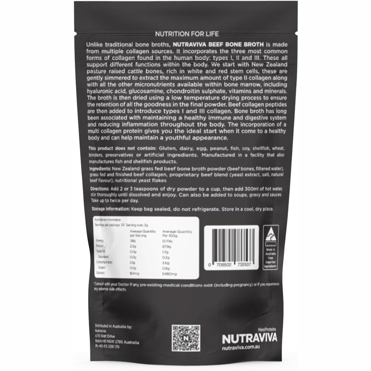 Nutraviva Beef Bone Broth powder is made with pasture-raised Australian and New Zealand beef cattle bones. These specially selected bones are rich in red and white stem cells and the low heat cooking process is used to draw out the collagen, marrow and other healing elements including amino acids, vitamins and minerals. This helps maximize the absorption of flavour, nutrients and goodness into our broths.