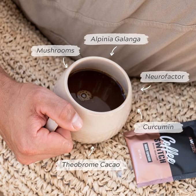 Colombian Single Origin Arabica Coffee Powder (55%), goMCT™ (Medium Chain Triglycerides 70% Conc. Powder, 30% Acacia Fibre), Organic Super 5 Mushroom Blend (Maitake, Cordyceps Militaris, King Trumpet, Shiitake, Turkey Tail), Galangal Powder, Bacopa Monnieri, Coffea Arabica Whole Fruit Powder, Natural Flavours, Natural Thickener (Acacia Gum), Theobroma Cacao, Sweetener (Stevia), Huperzia Serrata.