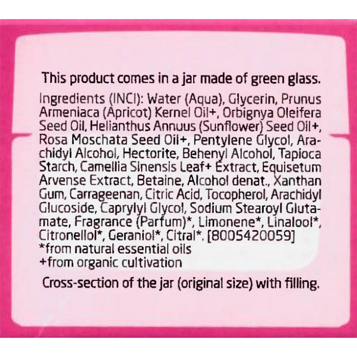 Water (Aqua), Glycerin, Prunus Armeniaca (Apricot) Kernel Oil+, Orbignya Oleifera Seed Oil, Helianthus Annuus (Sunflower) Seed Oil+, Rosa Moschata Seed Oil+, Pentylene Glycol, Ara- chidyl Alcohol, Hectorite, Behenyl Alcohol, Tapioca Starch, Camellia Sinensis Leaf+ Extract, Equisetum Arvense Extract, Betaine, Alcohol denat., Xanthan Gum, Carrageenan, Citric Acid, Tocopherol, Arachidyl Glucoside, Caprylyl Glycol, Sodium Stearoyl Gluta- mate, Fragrance (Parfum)*, Limonene*, Linalool*, Citronellol*, Geraniol*, Citral*. *from natural essential oils +from organic cultivation.