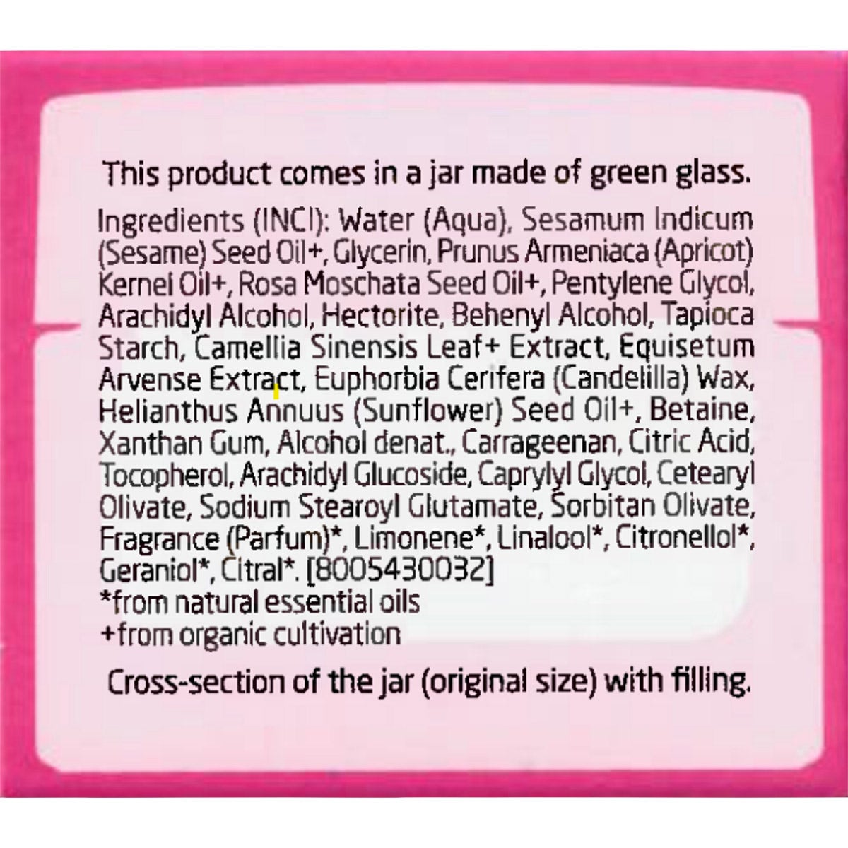 Water (Aqua), Sesamum Indicum (Sesame) Seed Oil+, Glycerin, Prunus Armeniaca (Apricot) Kernel Oil+, Rosa Moschata Seed Oil+, Pentylene Glycol, Arachidyl Alcohol, Hectorite, Behenyl Alcohol, Tapioca Starch, Camellia Sinensis Leaf+ Extract, Equisetum Arvense Extract, Euphorbia Cerifera (Candelilla) Wax, Helianthus Annuus (Sunflower) Seed Oil+, Betaine, Xanthan Gum, Alcohol denat., Carrageenan, Citric Acid, Tocopherol, Arachidyl Glucoside, Caprylyl Glycol, Cetearyl Olivate, Sodium Stearoyl Glutamate, Sorbitan Olivate, Fragrance (Parfum)*, Limonene*, Linalool*, Citronellol*, Geraniol*, Citral*. *from natural essential oils +from organic cultivation.